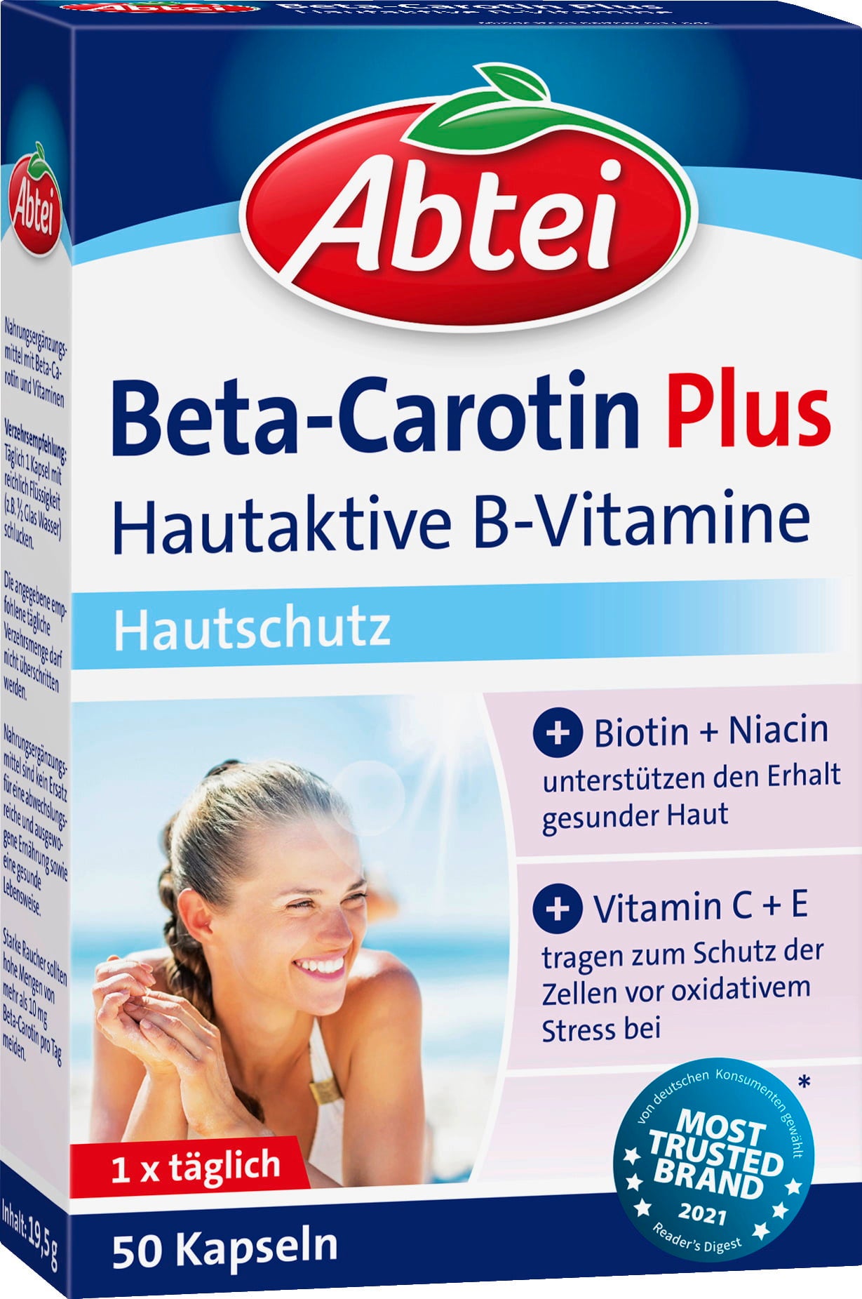 Abtei Beta-Carotin Plus комбинира бета-каротин с подбрани витамини и витамини от група B. Бета-каротинът се преобразува в организма във витамин A, който заедно с биотин и ниацин подпомага поддържането на нормална кожа. Витамин C допринася за нормалното образуване на колаген, докато витамин E, витамин C и рибофлавин (витамин B2) спомагат за защитата на клетките от оксидативен стрес. Капсулите са лесни за прием и подходящи за ежедневна хранителна добавка.