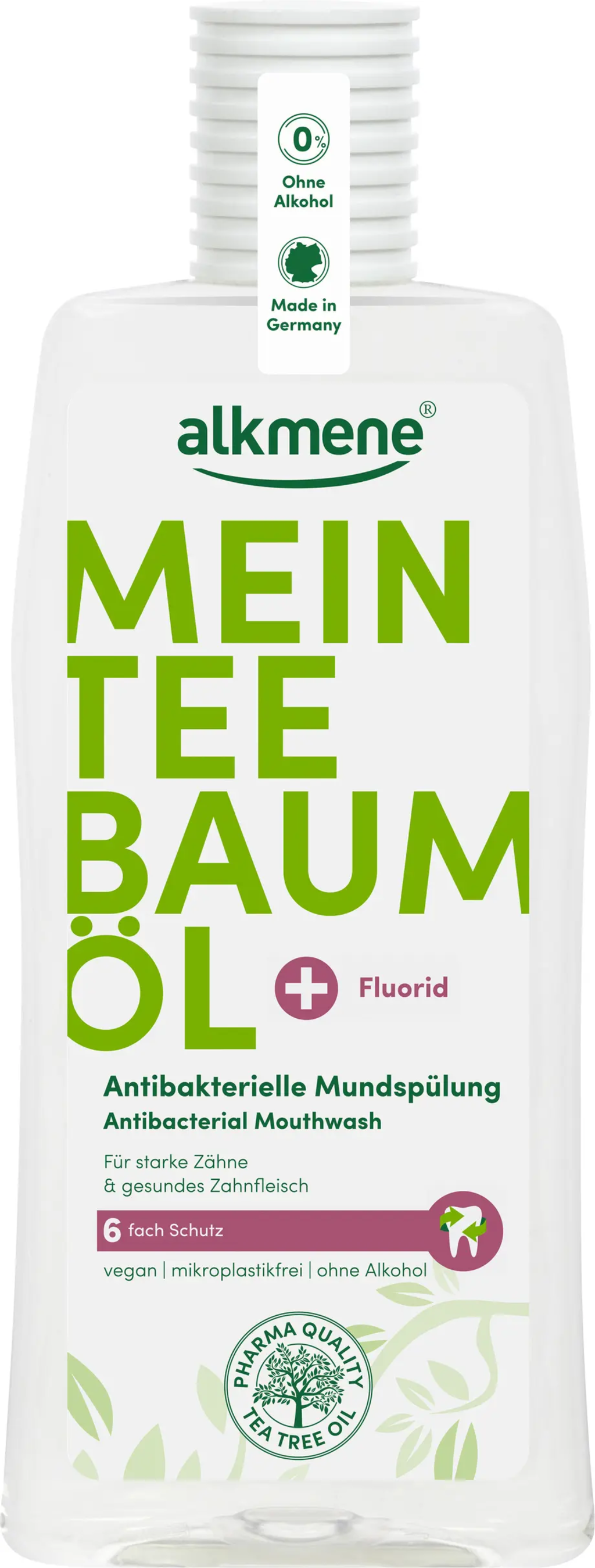 Мундщикът „Mein Teebaumöl Mundspülung“ от alkmene освежава дъха ти и осигурява добра защита за венците и срещу киселините от захарта, благодарение на маслото от чаено дърво и флуорида. Формулата е веган и не съдържа микропластмаса и алкохол.