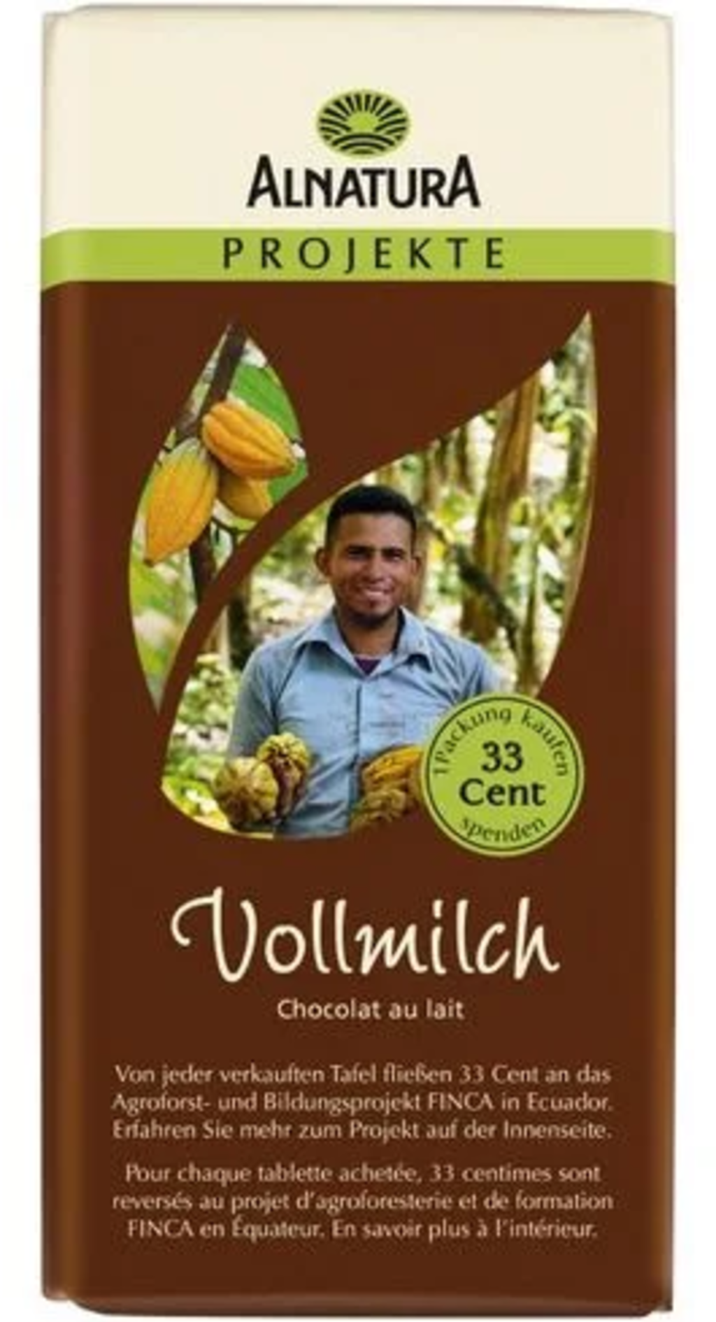 Малко да похапнете и да направите добро – с млечния шоколад на Alnatura от сътрудничеството с Plant-for-the-planet се наслаждаваш на „Die gute Schokolade“ („Добрият шоколад“): 33 цента от всяко продадено блокче подпомагат проекта FINCA в Еквадор. Разбира се, съставките са от контролиран био земеделски произход и са справедливо търгувани. Нерафинирана захар и истинска бурбон ванилия подчертават аромата и нежния разтапящ ефект.