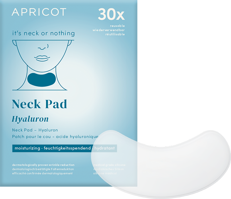 Този анти-ейдж пач за шия от медицински силикон на APRICOT осигурява на кожата на шията ви дълготрайна хидратация. Нискомолекулният хиалурон прониква дълбоко в кожата и я подхранва интензивно. Пачът може да се използва повторно до 30 пъти.