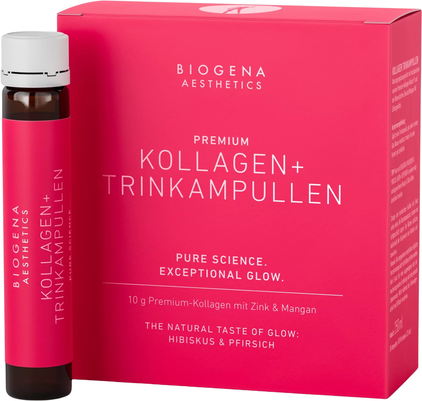 Ампулите за напитки BIOGENA AESTHETICS Premium Collagen+ са готови за употреба и съдържат точно премерена смес от морски колагенов хидролизат (Naticol®), цинк и манган, подсилена с плодов аромат на хибискус и праскова. Всяка ампула от 25 ml осигурява около 10 g висококачествен колагенов протеин от морски източници, заедно с определени количества цинк и манган, които спомагат за поддържането на нормална кожа и предпазват клетките от оксидативен стрес.