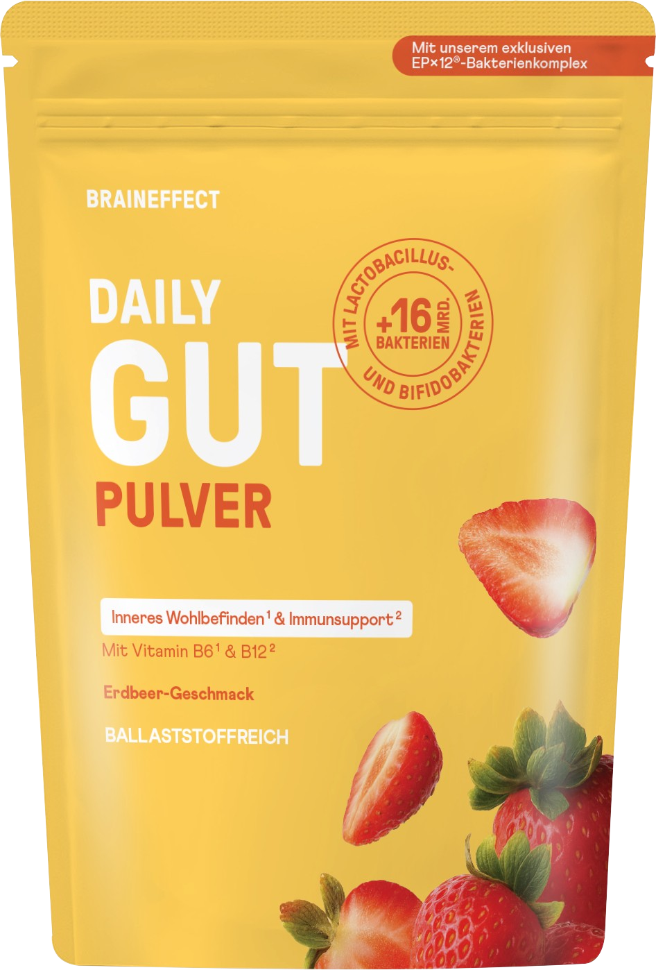 Царевичен декстрин, Акациеви влакна, Säuerungsmittel (Citronensäure), L-тирозин, оцветяване на храна (Сок от цвекло прах), natürliches Aroma, EPx12®⁷ Bakterienmischung (Bifidobacterium lactis, Lactobacillus paracasei, Лактобациликус Плантарум, Lactobacillus casei, Bifidobacterium Longum, Lactobacillus acidophilus, Lactobacillus brevis, Lactobacillus rhamnosus, Bifidobacterium infantis, Bifidobacterium breve, Lactobacillus bulgaricus, Bifidobacterium bifidum), 1 % ягодов прах (ягоди, малтодекстрин, Säureregulator (Citronensäure)), konzentriertes Mönchsfrucht-Extrakt, Подсладител (Steviolglycoside aus Stevia), Оцветител (Beta-Carotin), Vitamin B12, Vitamin B6, Riboflavin, Thiamin (Vitamin B1)