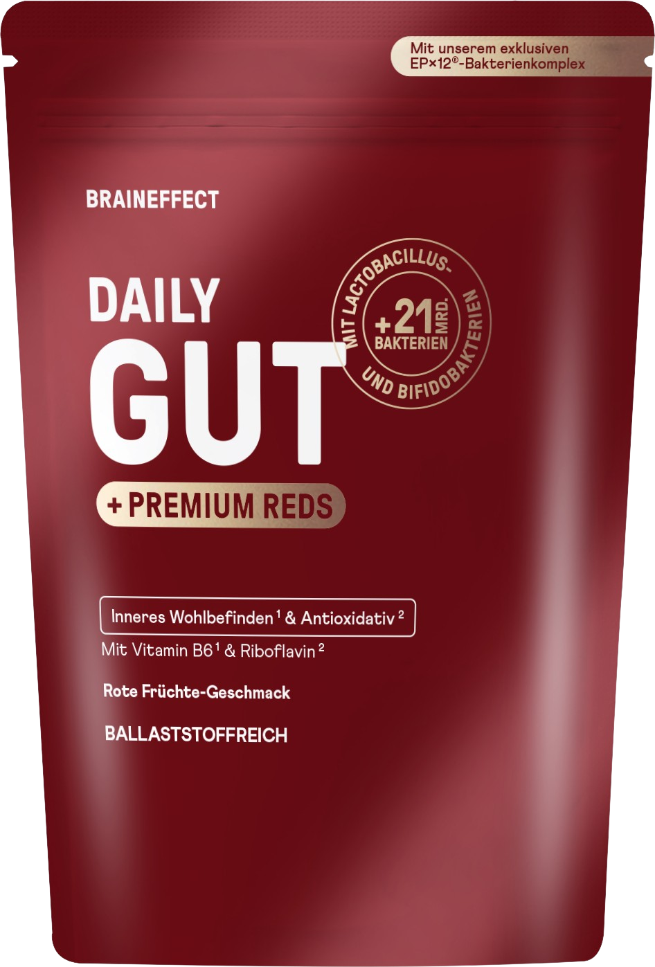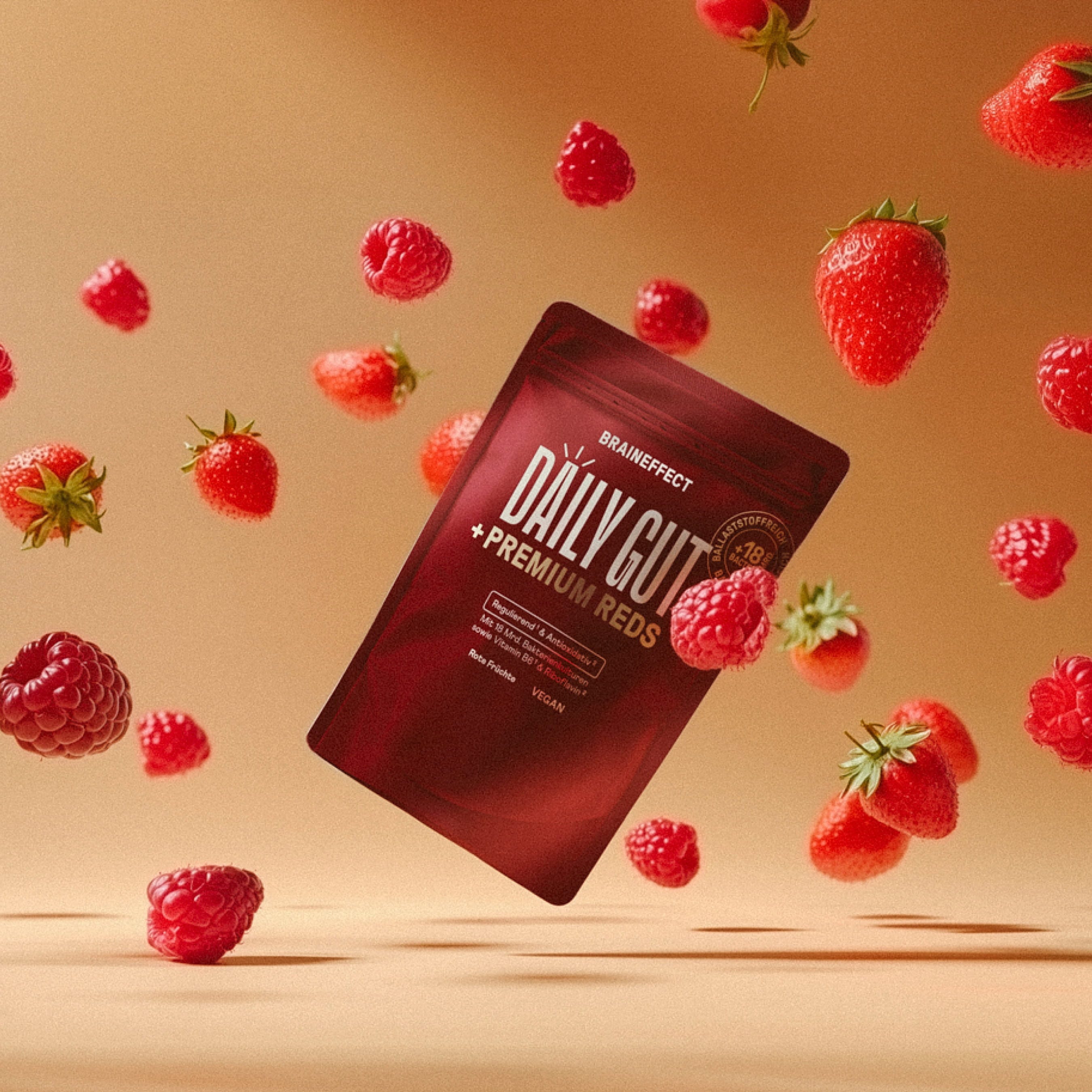 Daily Gut + Premium Reds е прах от BRAINEFFECT. Съдържа 18 милиарда активни бактериални култури от 12 подбрани щама Lactobacillus и Bifidobacterium. Те се срещат естествено и в червата. Освен това прахът включва седем естествени храносмилателни ензима. Формулата е допълнена с плодова комбинация от седем червени плода, които доставят антиоксиданти. Освен това прахът е без добавена захар и без изкуствени подсладители.