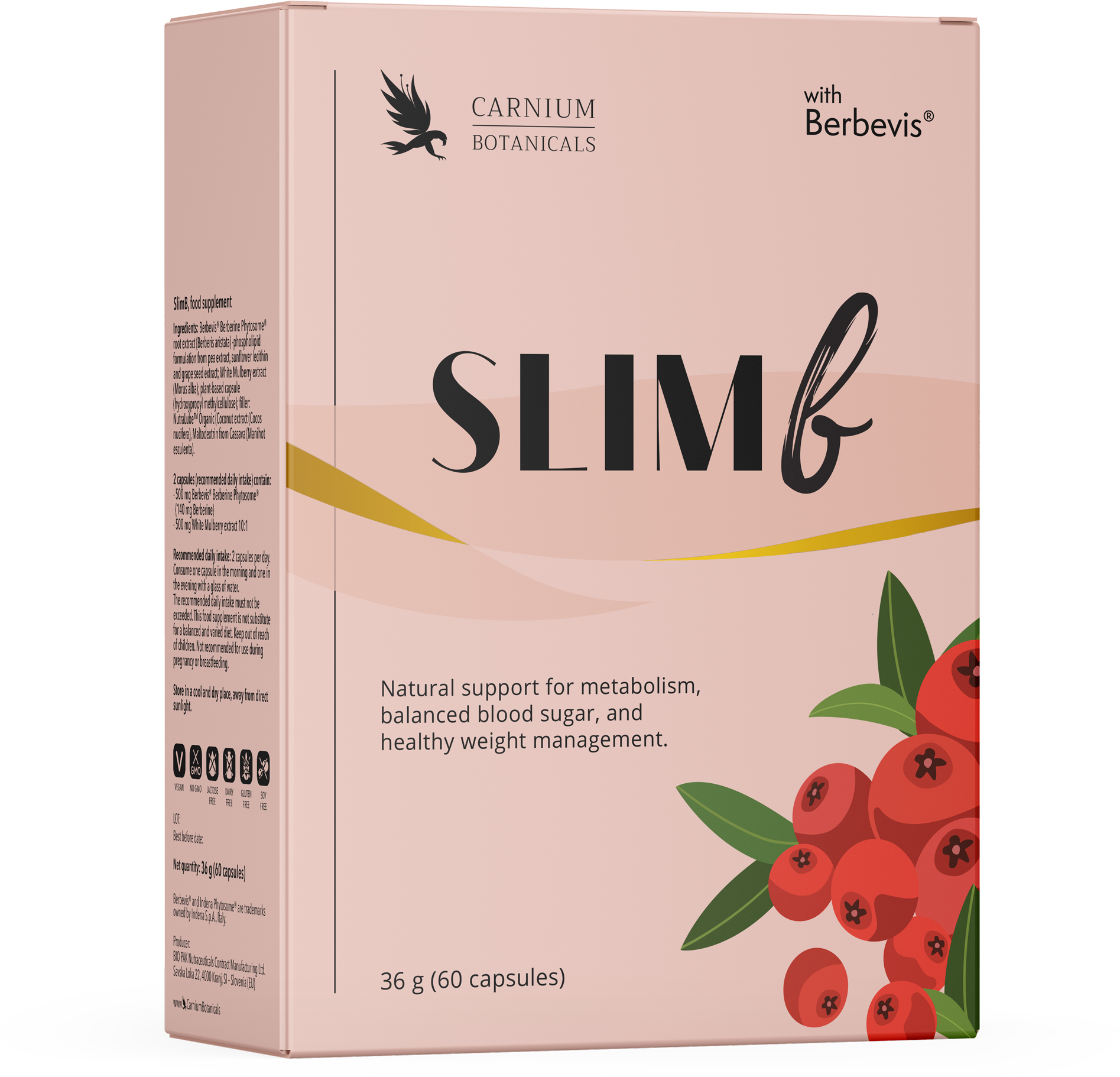 SlimB на Carnium Botanicals е нутриентен комплекс с Berbevis® (съвременна форма на берберин) и патентованата технология Phytosome™ с висококонцентриран екстракт от листа на бяла черница. Формулата на капсулите е веган и без глутен, лактоза и консерванти.