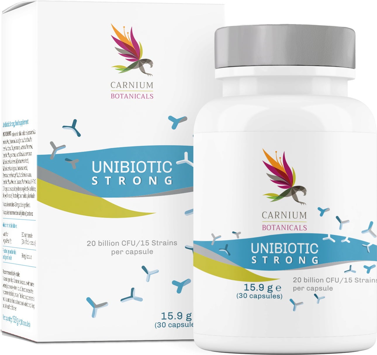 Unibiotic STRONG на Carnium Botanicals съдържа смес от 15 пробиотични щама и пребиотици. Сред тях са например Lactobacillus acidophilus, Lactobacillus rhamnosus, Bifidobacterium breve и Streptococcus thermophilus. Допълнително капсулите съдържат растителен инулин и фруктоолигозахариди. Капсулите са 100% веган и без глутен.