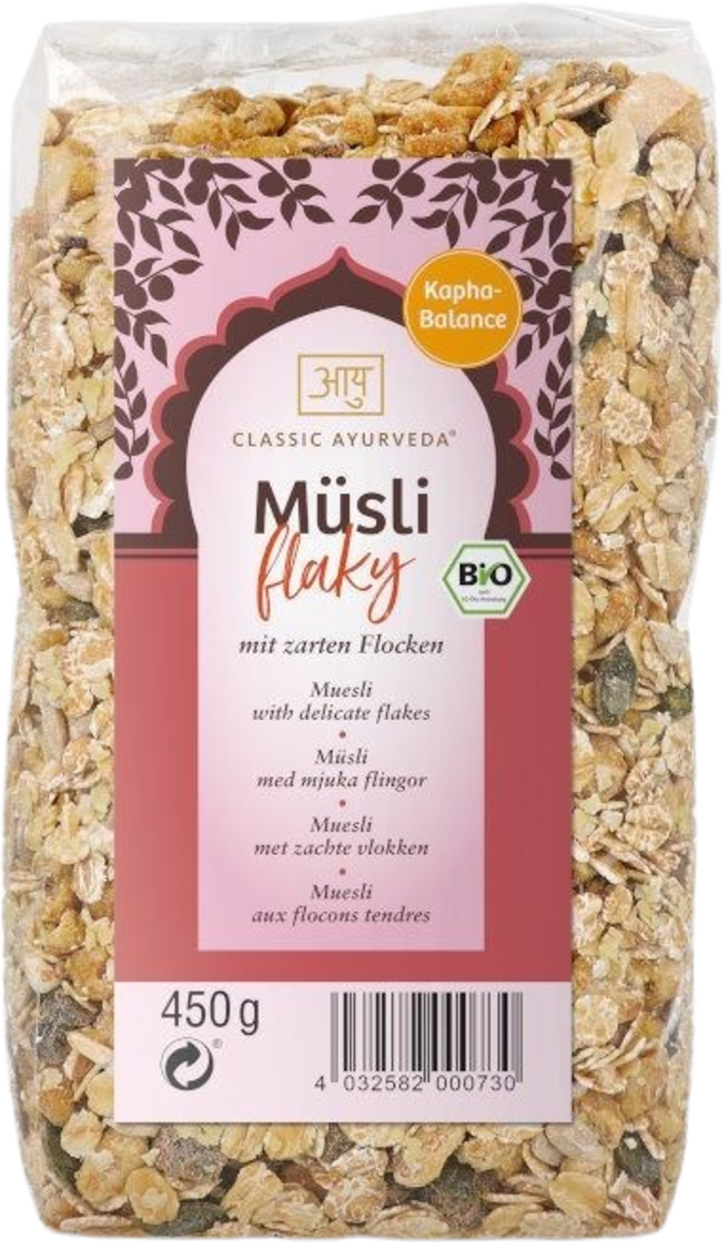 Био мюсли Flaky – Kapha от Classic Ayurveda е смес, създадена целенасочено за подкрепа на пракрити с преобладаваща Капха. Основата се състои от ценни пълнозърнести овесени, ечемични, просени и ръжени ядки, комбинирани с пухкави спелтови попс, подсладени с мед. Плодов акцент придават сушените кайсии, а слънчогледовите и тиквените семена допринасят за балансирана текстура. Рецептата е завършена с аюрведична селекция от подправки и цветове като копър, хибискус, кардамон и джинджифил. Всички съставки произхождат от контролирано биологично земеделие.