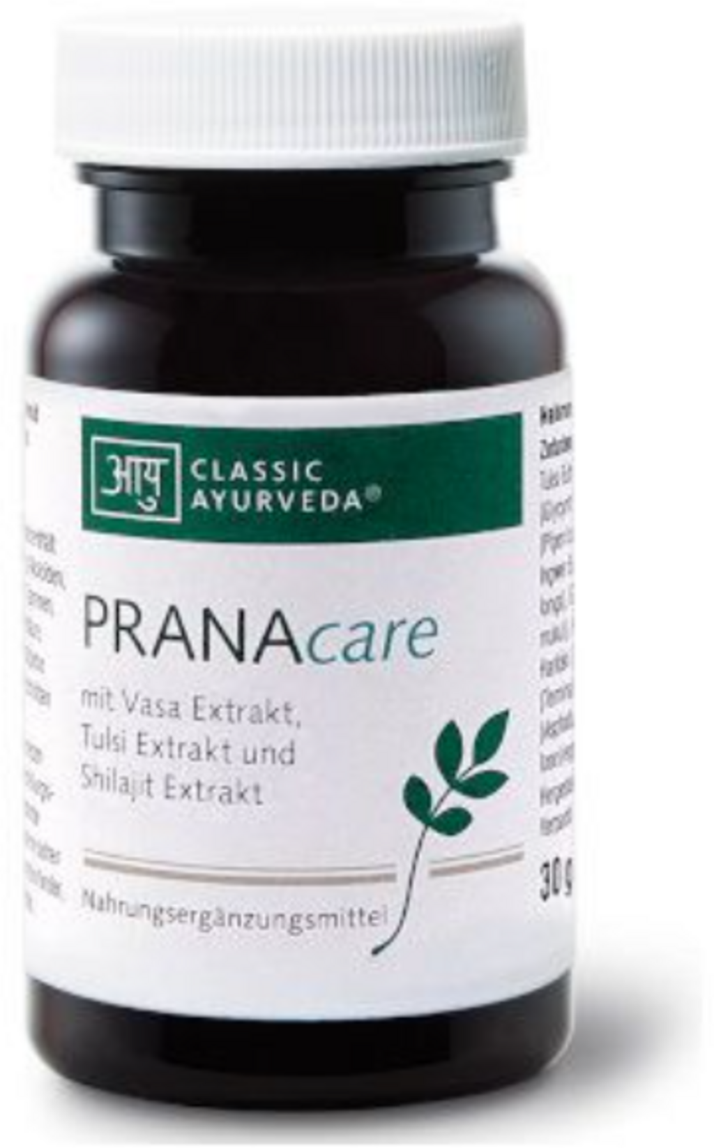 Капсулите PRANAcare от Classic Ayurveda съдържат съчетание от висококачествени растителни екстракти и традиционни подправки. Рецептурата е на база Vasa и Tulsi, комбинирани със Süßholz, куркума и Guggulu. Сместа е допълнена от Shilajit, Triphala компонентите Amla, Haritaki и Bibhitaki, както и Trikatu подправките Pippali, черен пипер и джинджифил.