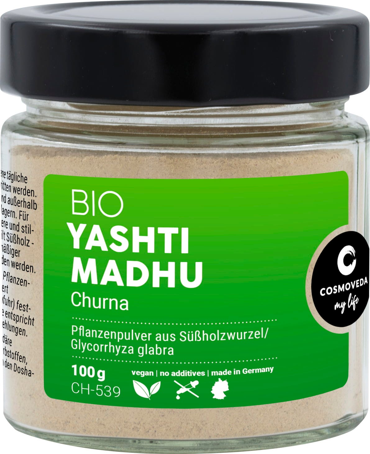 Яштимадху - Glycyrrhiza glabra - е дълголетно многогодишно растение. Сокът от коренища и пресен корен се използва в аюрведичната диета. Прахът от изсушените корени, който е фино и нежно смлян (под 40 ° C) в нашето производство, идва от нашите проекти за справедлива търговия.