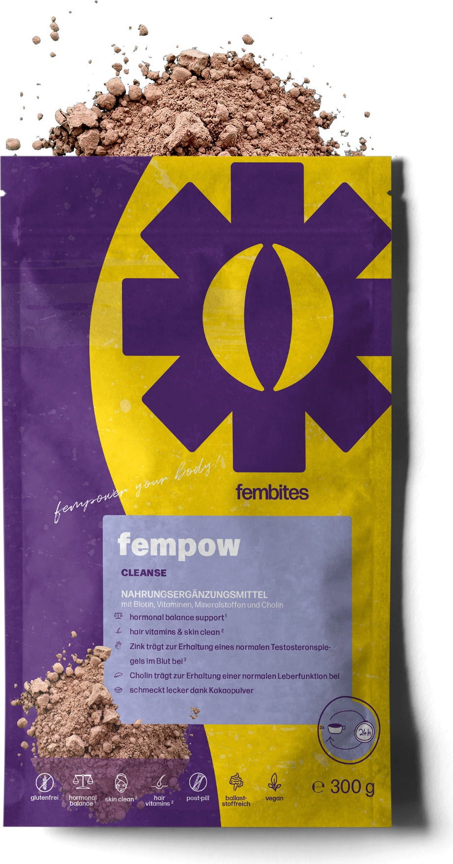 fempow® CLEANSE е прах за ежедневен прием, съдържащ цинк, биотин, холин, селен и витамин C – комбинирани с фибри и растителни екстракти като артишок и дамска мантия. Формулата е веган, без глутен и не съдържа добавена захар¹.