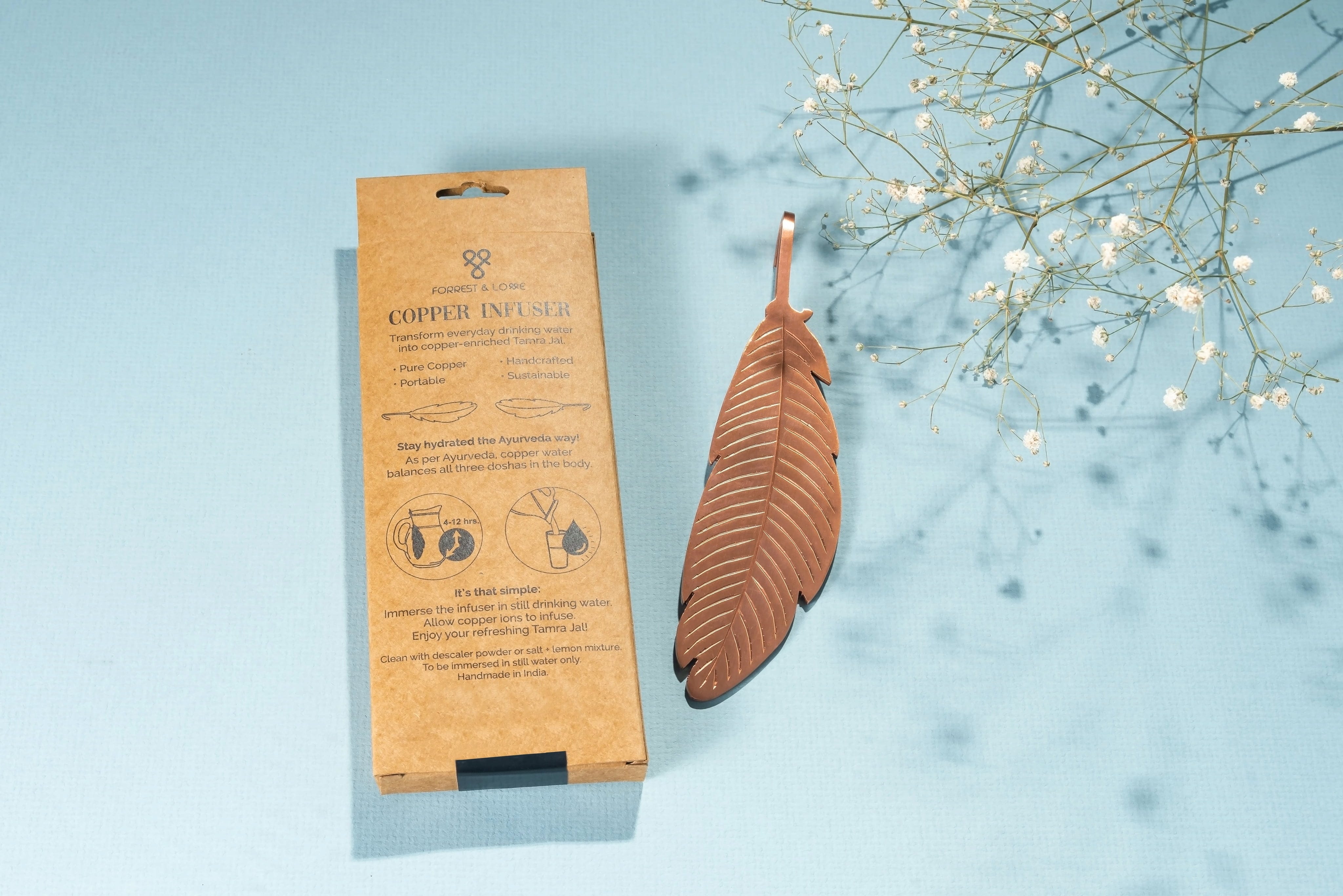 Практичният и внимателно изработен ръчно инфузор от FORREST & LOVE може да се използва за почти всеки съд за вода, за да се насладите максимално на жизненоважната освежаваща и копринено мека медна вода! Стилният дизайн убеждава с дълготрайната си издръжливост, както и с пестенето на ресурси, устойчивото и справедливо производство.
