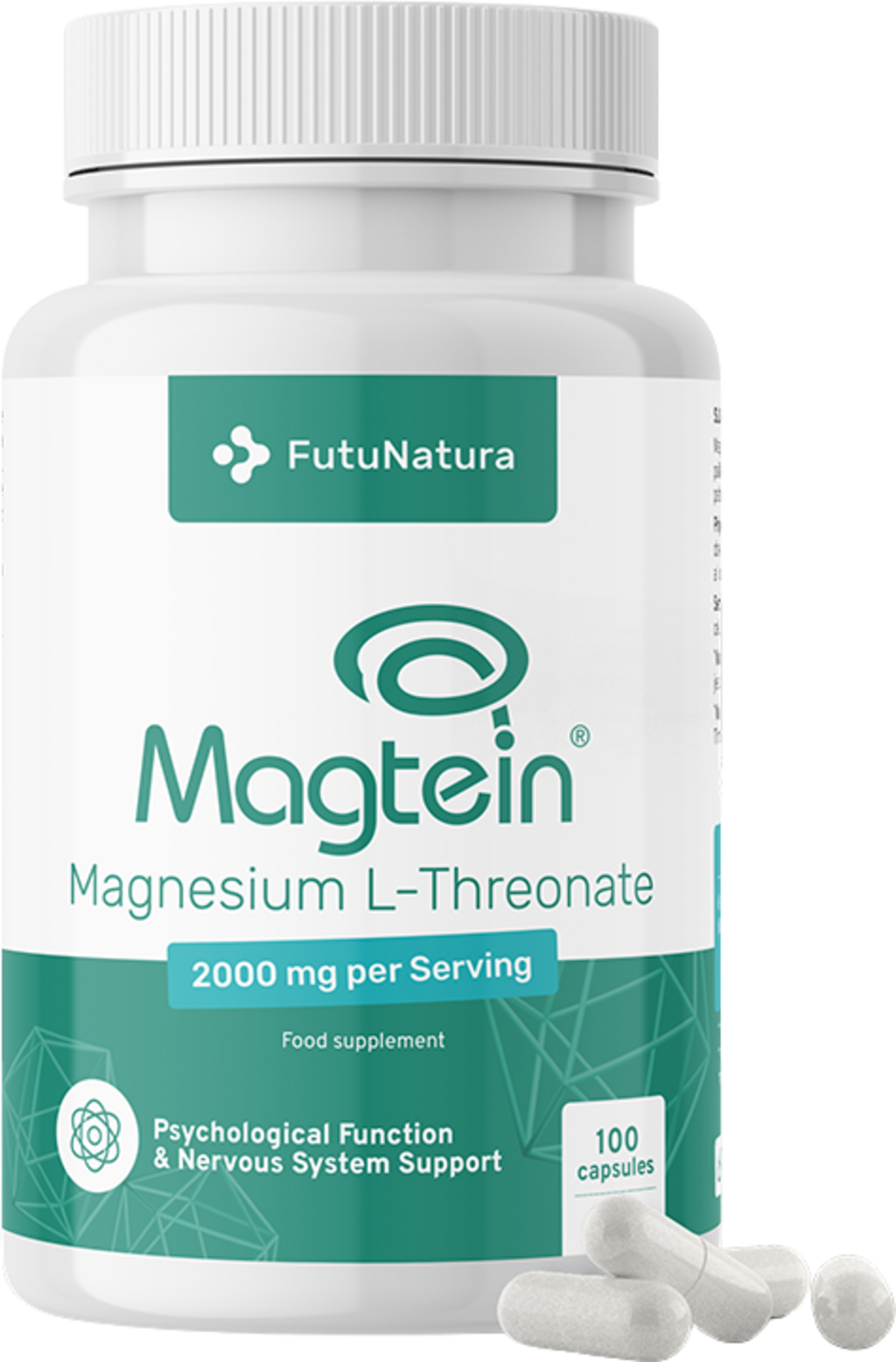 Magnesium L-threonate Magtein® 2000 mg е продукт на FutuNatura. Magtein® е иновативна, патентована форма на магнезий, която съдържа магнезиев L-треонат. Капсулите са веган. Практичната капсулна форма позволява лесно дозиране.