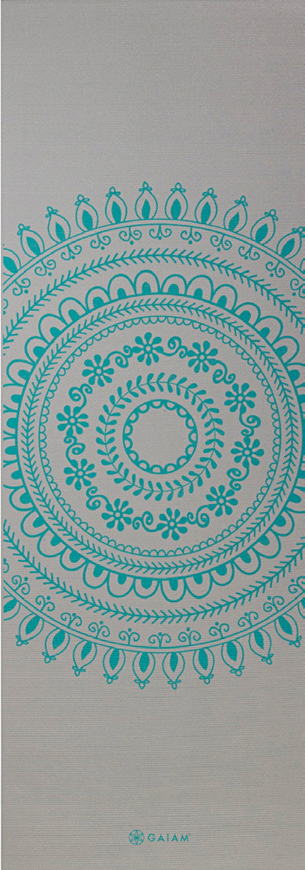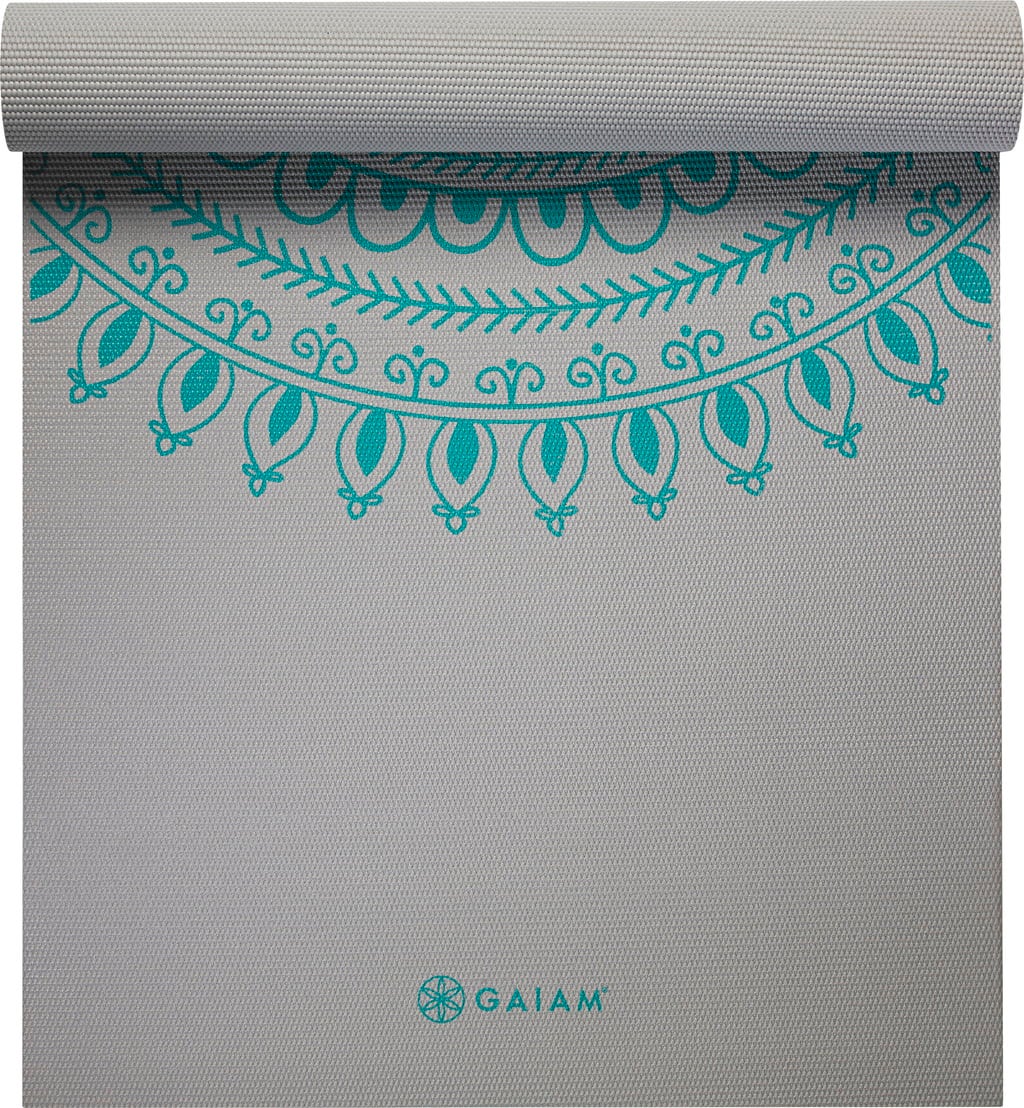 GAIAM Постелка за йога LONGER / WIDER MARRAKESH, сиво с тюркоазен дизайн