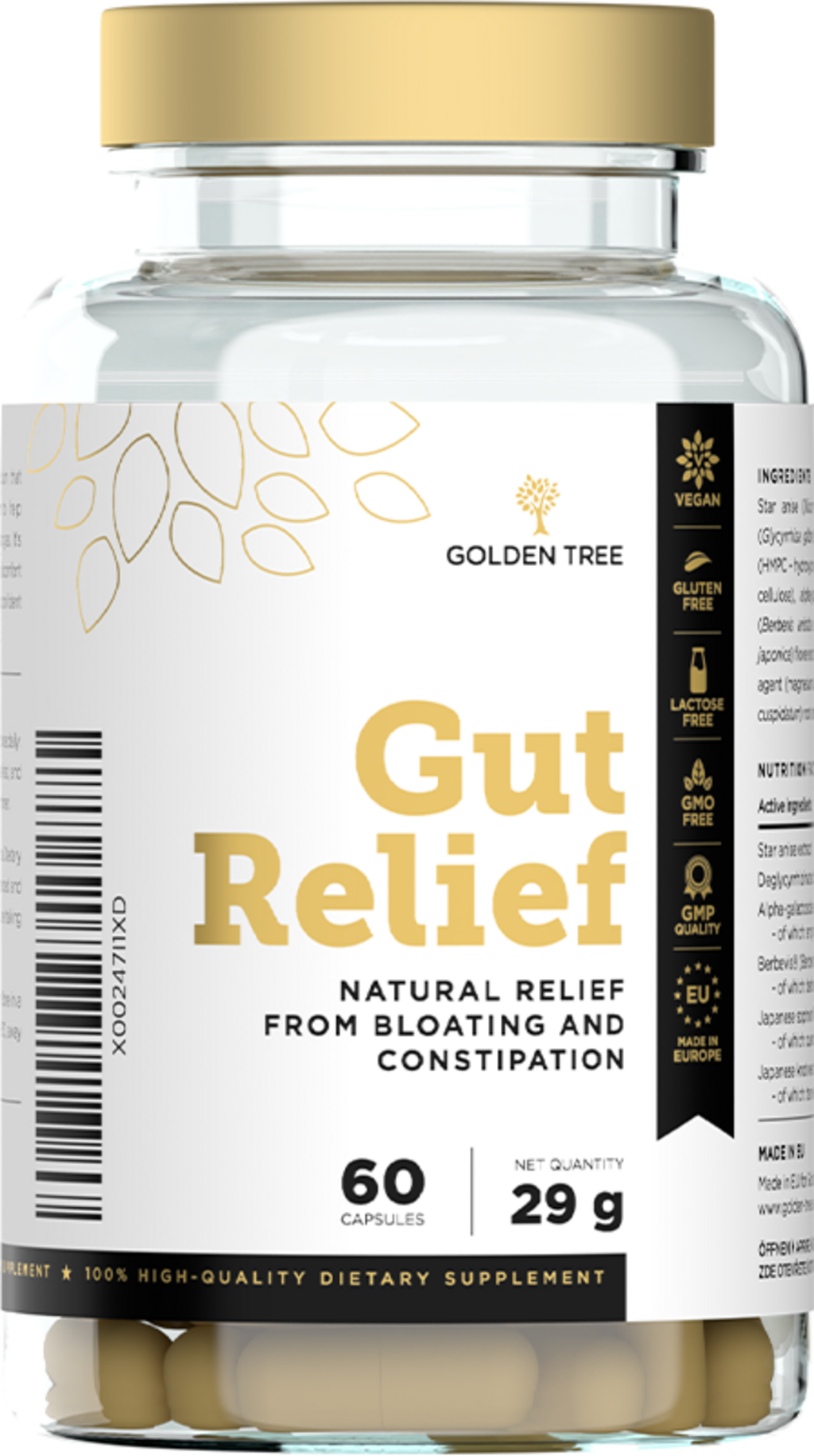 Gut Relief от Golden Tree съчетава пет висококачествени растителни екстракта с ензима алфа-галактозидаза. Веган капсулите не съдържат кофеин и други стимуланти.