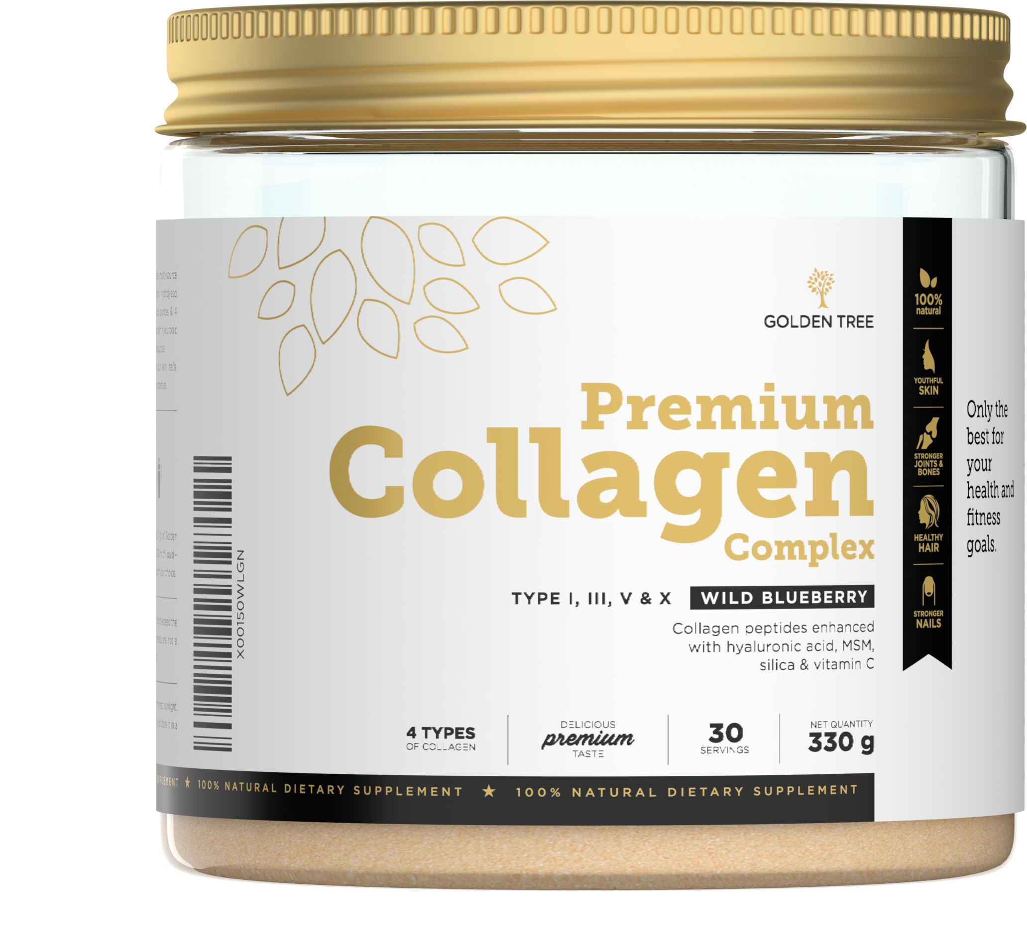 Колагенът е важен градивен елемент за много от нашите тъкани, осигурявайки структура и здравина на телата ни. Премиум колагеновият комплекс на Golden Tree съдържа колаген типове I, III, V и X. Източникът му е хидролизиран рибен колаген, хидролизиран говежди колаген и хидролизиран яйчен колаген. Формулата е допълнена с хиалуронова киселина, силиций и витамин C, които допринасят за нормалното образуване на колаген.