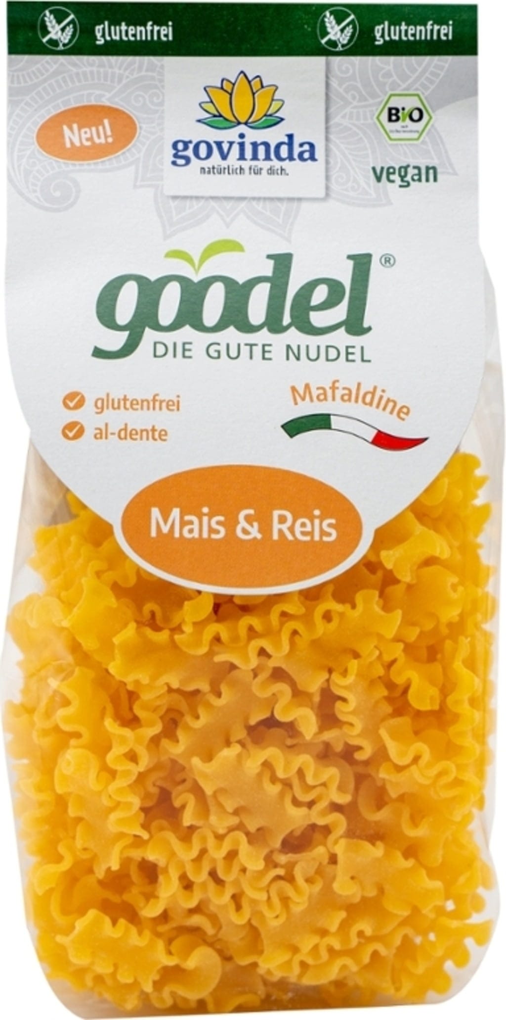 Goodel Mafaldine от Govinda внасят автентично италианско паста изживяване в безглутеновата кухня. Произведени от царевица и ориз в специализирана мануфактура, тестото се обработва и изсушава щадящо, за да се запази оптималната текстура. Характерната вълнообразна форма на Mafaldine задържа сосовете особено добре и впечатлява с мек вкус. Висококачествена био алтернатива за хора, които ценят първокласни съставки и внимателна обработка.