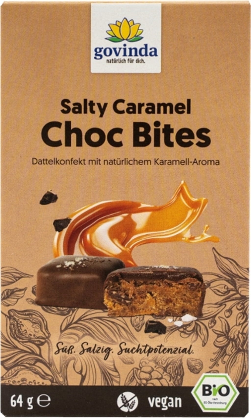 Salty Caramel Choc Bites от Govinda са изискано конфектно изделие на база фурми и смлян нахут. Обвити в кувертюра с минимум 70% какао, сладостта на агаве сироп се среща с щипка морска сол и естествен карамелен аромат. Тази веган рецептура от контролирано биологично производство предлага специално вкусово изживяване за осъзнати ценители. Удобната опаковка е подходяща за път или като малка изненада.