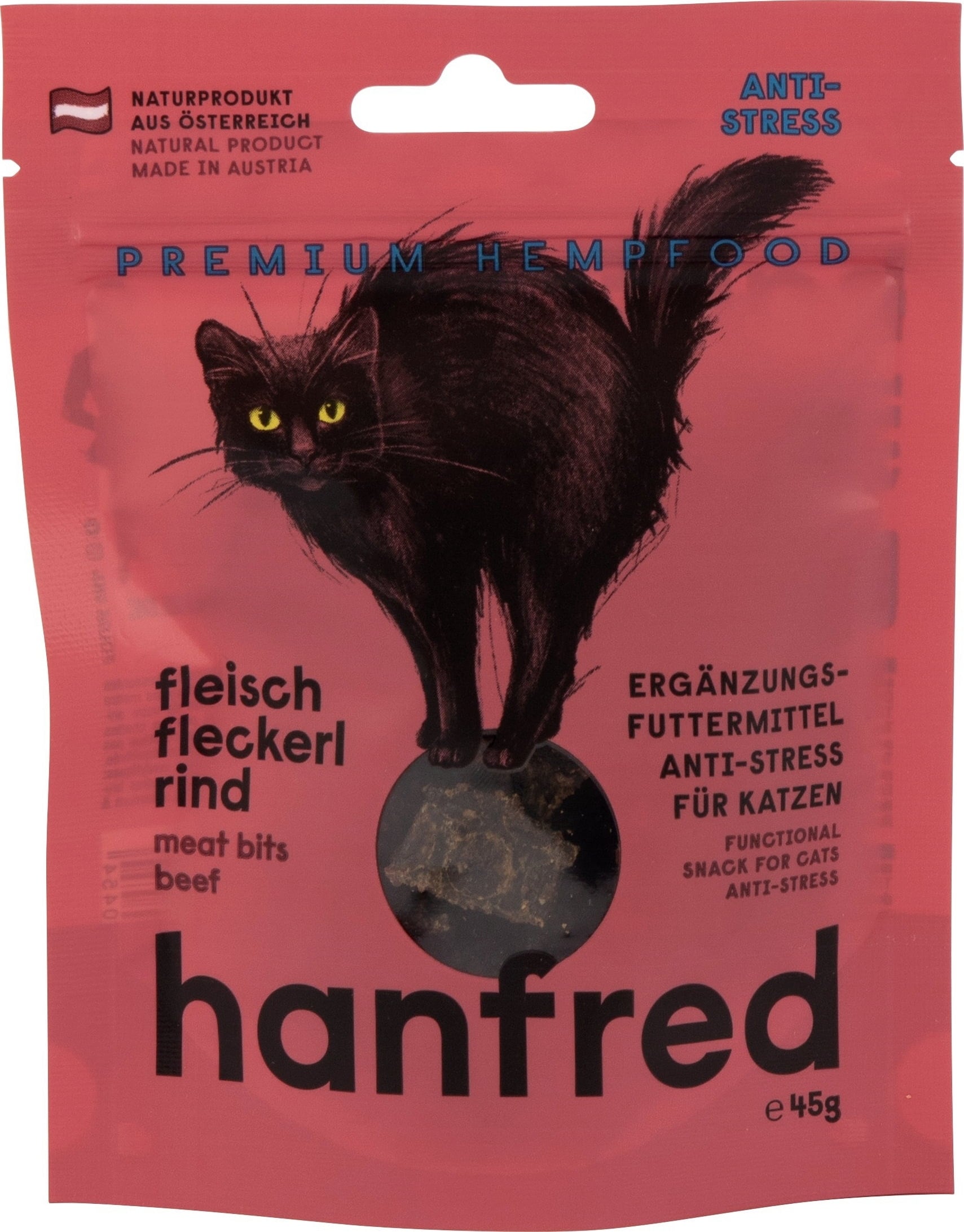 Ако котката ви е чувствителна към промени или стресови ситуации, тази закуска може да бъде добър избор. Месните хапки Hanfred са направени с 95% месо и 5% конопен прах – напълно без зърнени храни и изкуствени добавки.