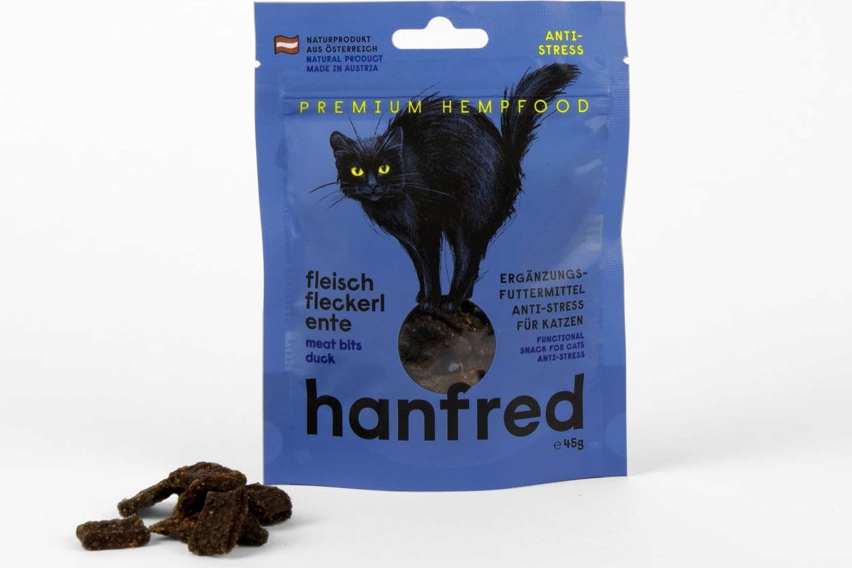 Ако котката ви е чувствителна към промени или стресови ситуации, тази закуска може да бъде добър избор. Месните хапки Hanfred са направени с 95% месо и 5% конопен прах – напълно без зърнени храни и изкуствени добавки.