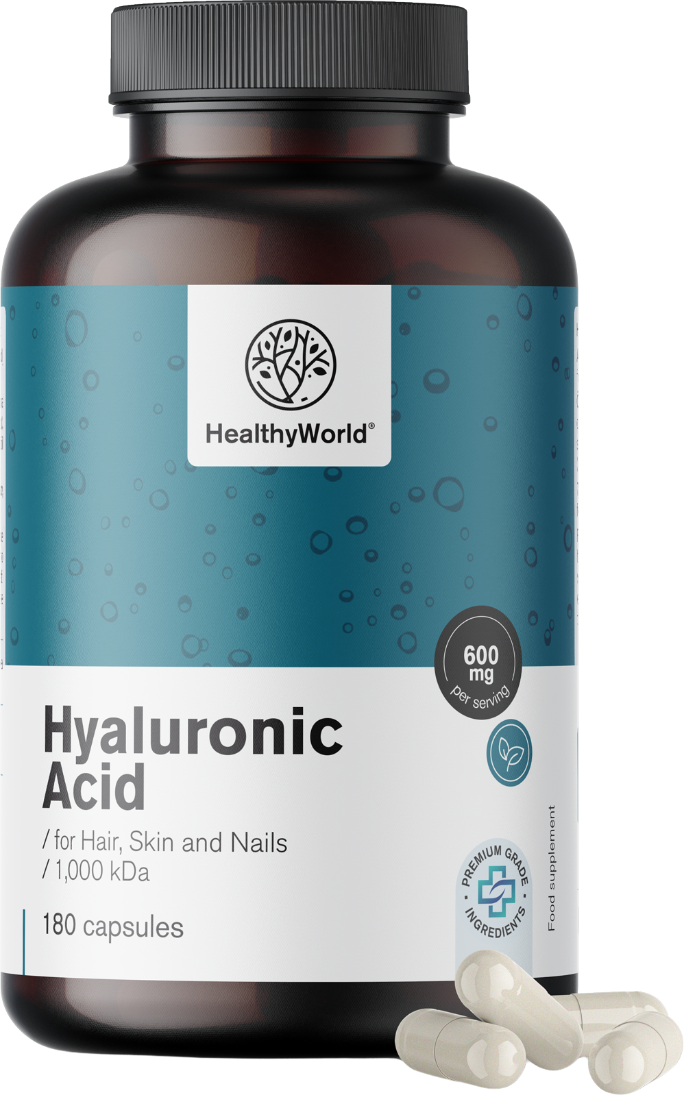 Hyaluronic Acid 600 mg от HealthyWorld съдържа хиалуронова киселина, която се среща естествено в човешкия организъм. Капсулите са изцяло от растителни съставки и позволяват лесно дозиране.