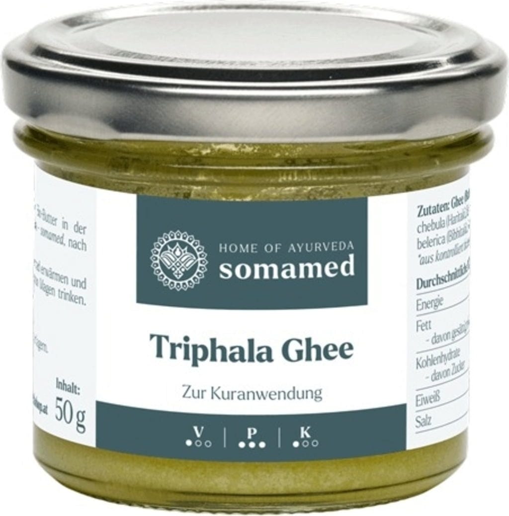 40 g масло гхи[1] (изяснено масло), 13 g Triphala Pulver (98,5 % Билки (плодов прах от микробаланс , плодове от амла (Amalaki, Emblica officinalis) , Bibhitaki (Terminalia bellerica) екстракт , Rosa centifolia))