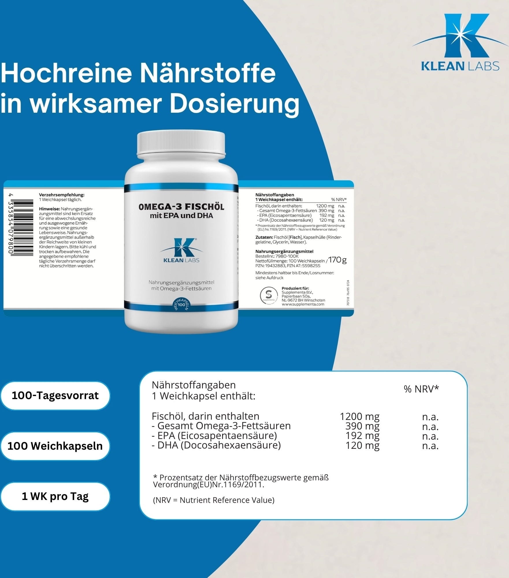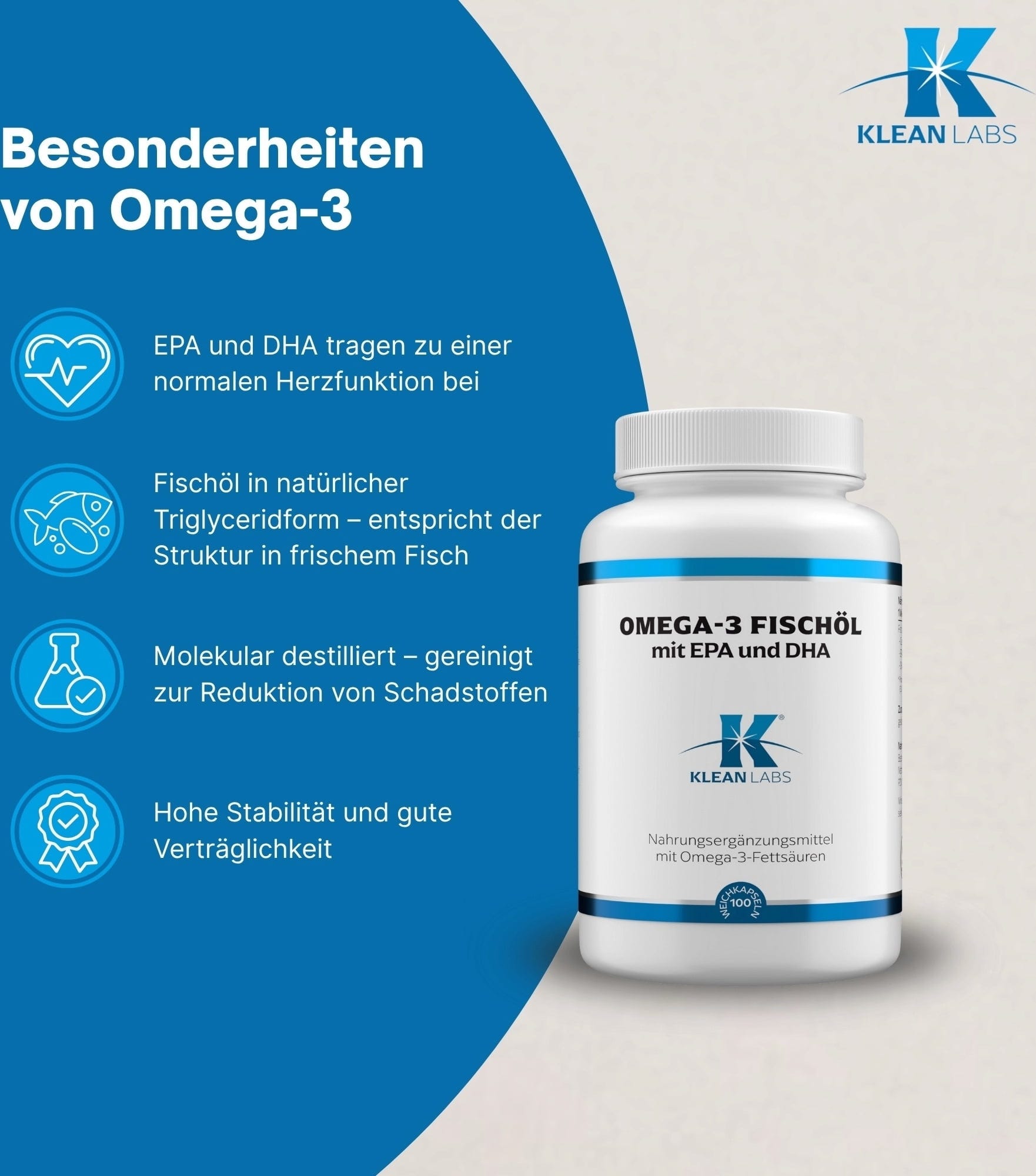 Klean Labs Omega-3 Fish Oil Softgels съдържа рибено масло, което е естествен източник на омега-3 мастни киселини. Всяка капсула съдържа 390 mg омега-3 мастни киселини (в естествената им триглицеридна форма), 192 mg ейкозапентаенова киселина и 120 mg докозахексаенова киселина на капсула.