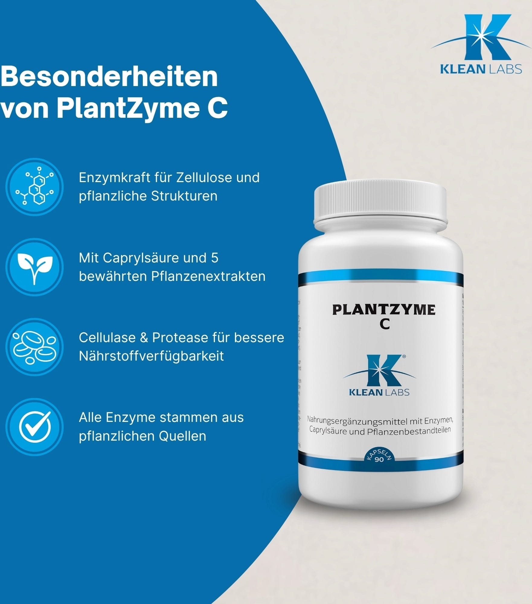 PlantZyme C комбинира ензими като целулаза, хемицелулаза и протеаза с каприлова киселина и подбрани растителни екстракти от риган, орех, чесън, черен орех и корен от юка. Формулата е специално разработена за диета с високо съдържание на фибри на растителна основа.