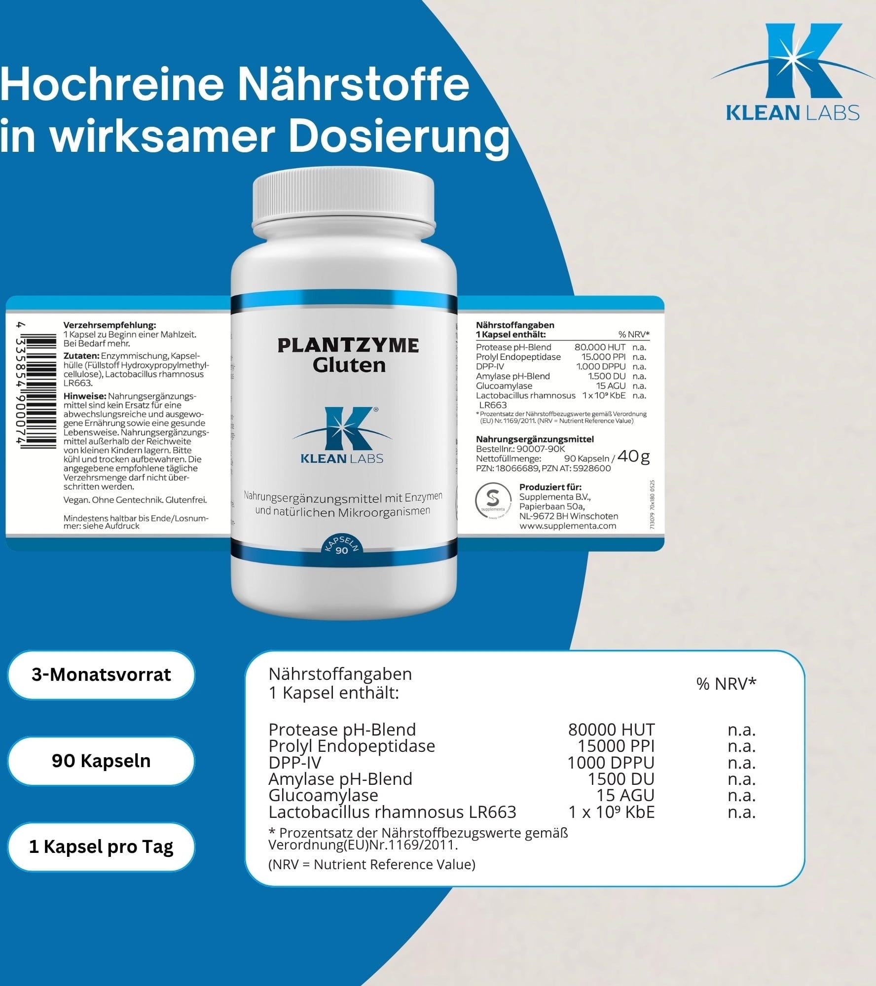 PlantZyme Gluten съдържа комбинация от протеаза и ензима DPP-IV, който специфично разгражда глутеновите и казеинови структури. Към формулата е добавена амилаза, която подпомага разграждането на нишестето от зърнените култури. Продуктът е веган, без глутен, без ГМО и без изкуствени добавки.