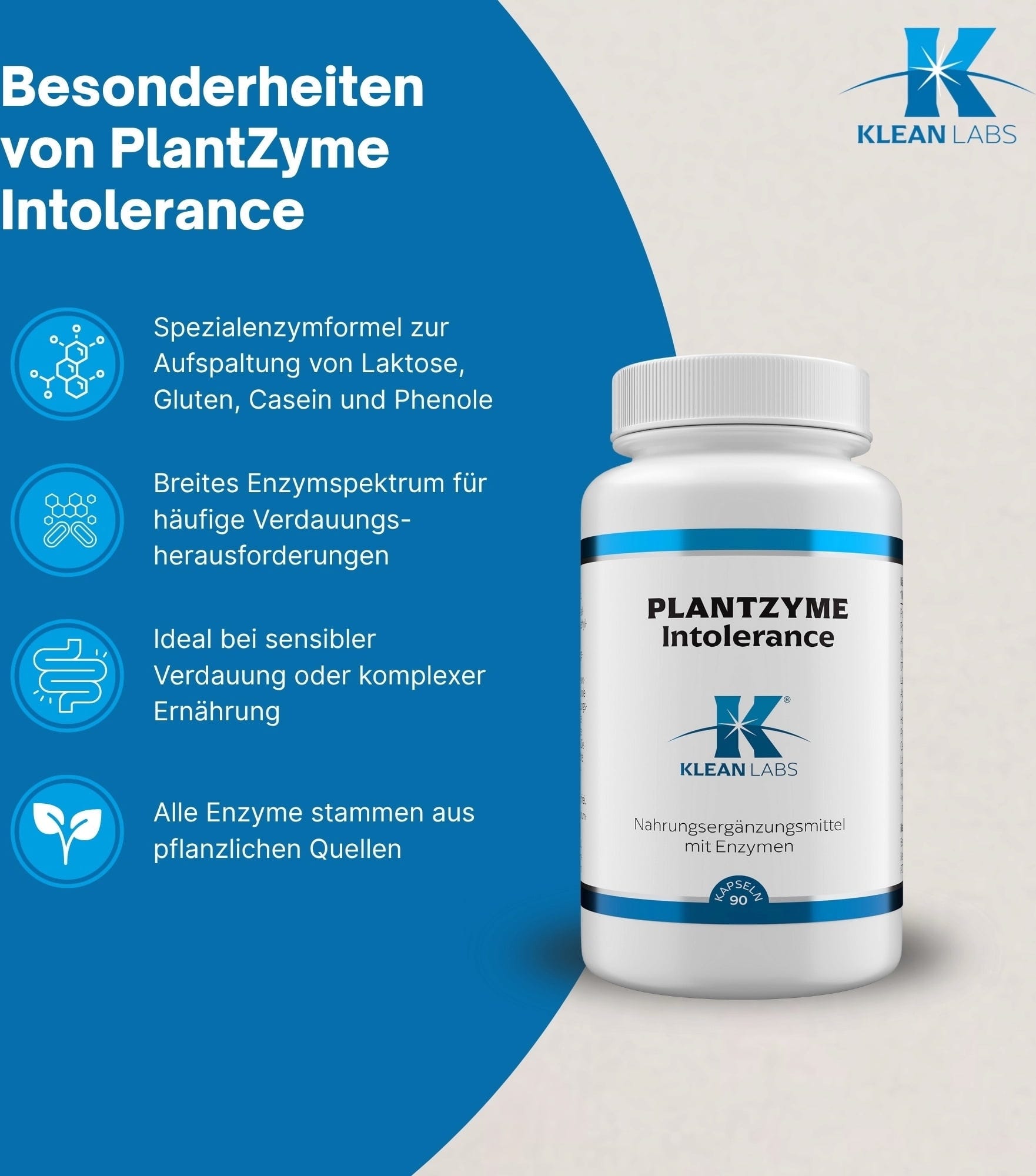 PlantZyme Intolerance е специално разработена смес от растителни ензими, специално пригодени за разграждане на различни хранителни компоненти като лактоза, казеин, глутен и феноли. Съдържа, наред с други, амилаза, протеаза и липаза, които ензимно разграждат въглехидрати, протеини и мазнини.