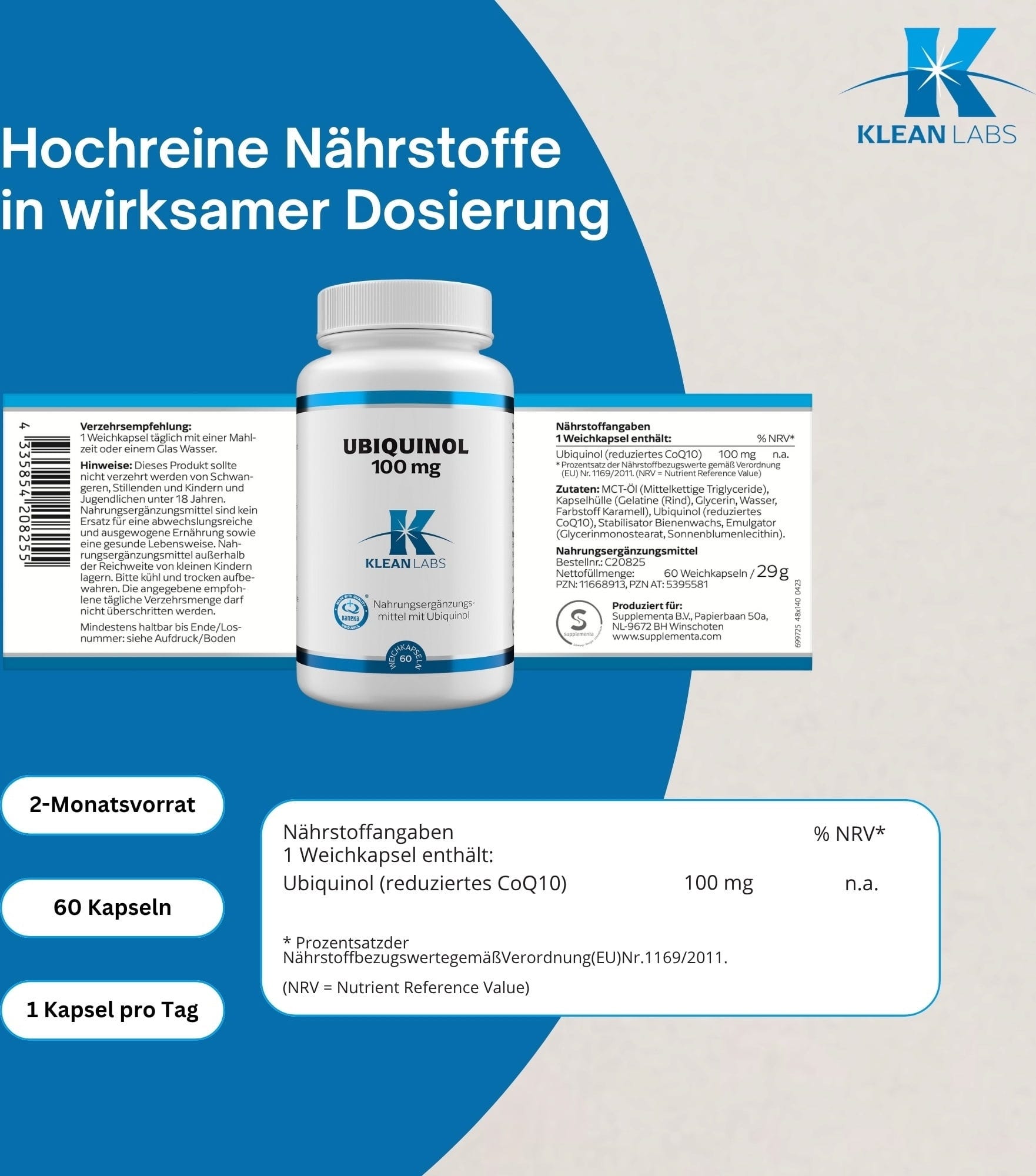 | Отговорна компания за храни: | Supplementa Corporation B.V., Papierbaan 50a, 9672 BH, Winschoten, Нидерландия, info@supplementa.com |