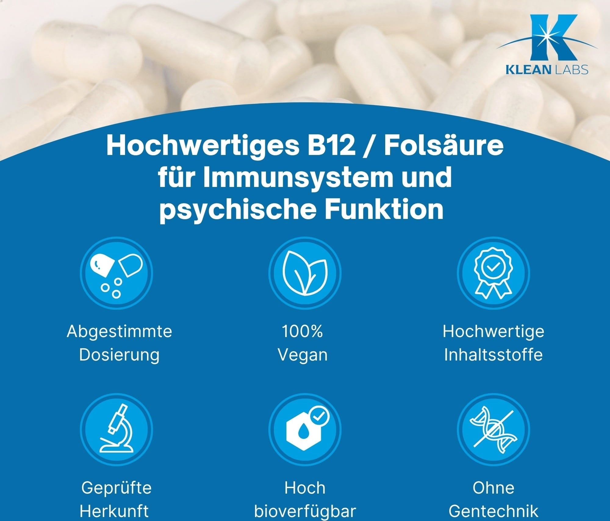 Тъй като организмът не може да произвежда сам витамин В12, капсулите с витамин В12 и фолиева киселина на Klean Labs са идеална хранителна добавка. Благодарение на растителната обвивка на капсулите, те са подходящи и за вегетариански и вегански диети. Капсулите не съдържат ароматизатори, оцветители и консерванти
