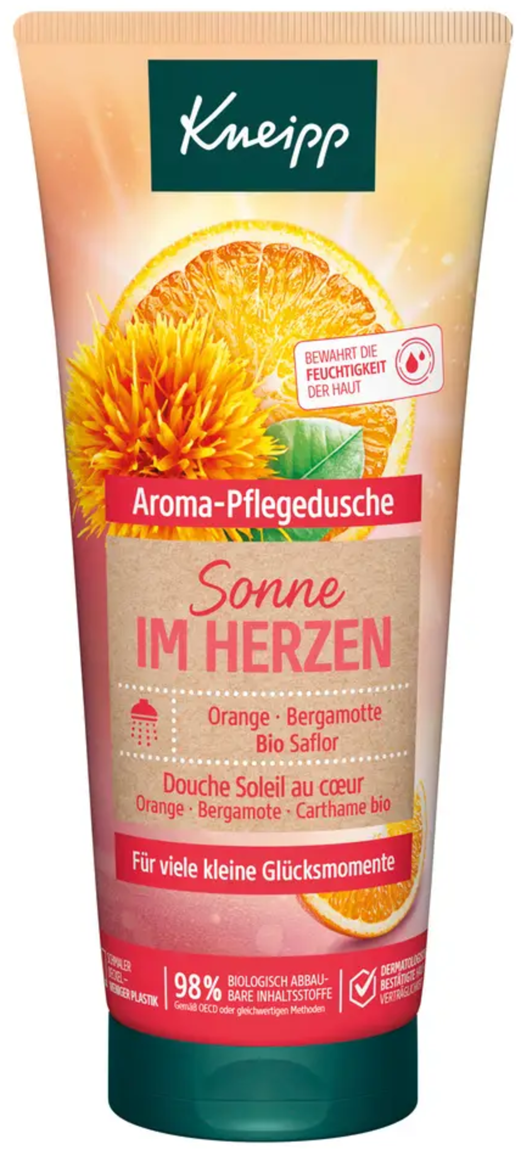 Този ароматен душ-гел от Kneipp ще ви очарова още под душа със своя освежаващ цитрусов аромат от етерични масла на портокал и бергамот. Ценното био масло от сафлор подпомага усещането за приятно мека кожа по време и след душ.