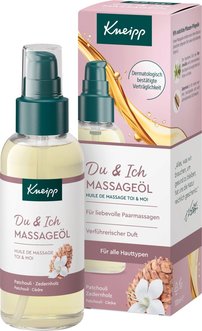 Масажното масло You & Me на Kneipp съдържа подхранващи растителни масла, витамин Е и натурални етерични масла от кедър и пачули. То се абсорбира бавно в кожата за приятно масажно изживяване.