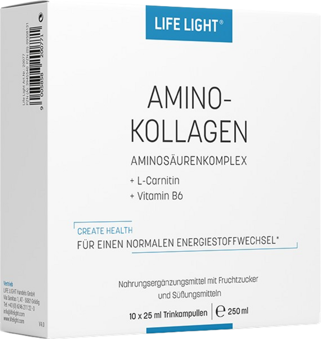 Amino-Collagen от LIFE LIGHT® осигурява комплекс от колагенови аминокиселини в практични ампули за пиене. Всяка ампула съдържа хидролизирани аминокиселини от говежди колаген, допълнени с L-карнитин, витамин В6, фруктоза и подсладител. Идеална за неусложнен прием по време на път или у дома.