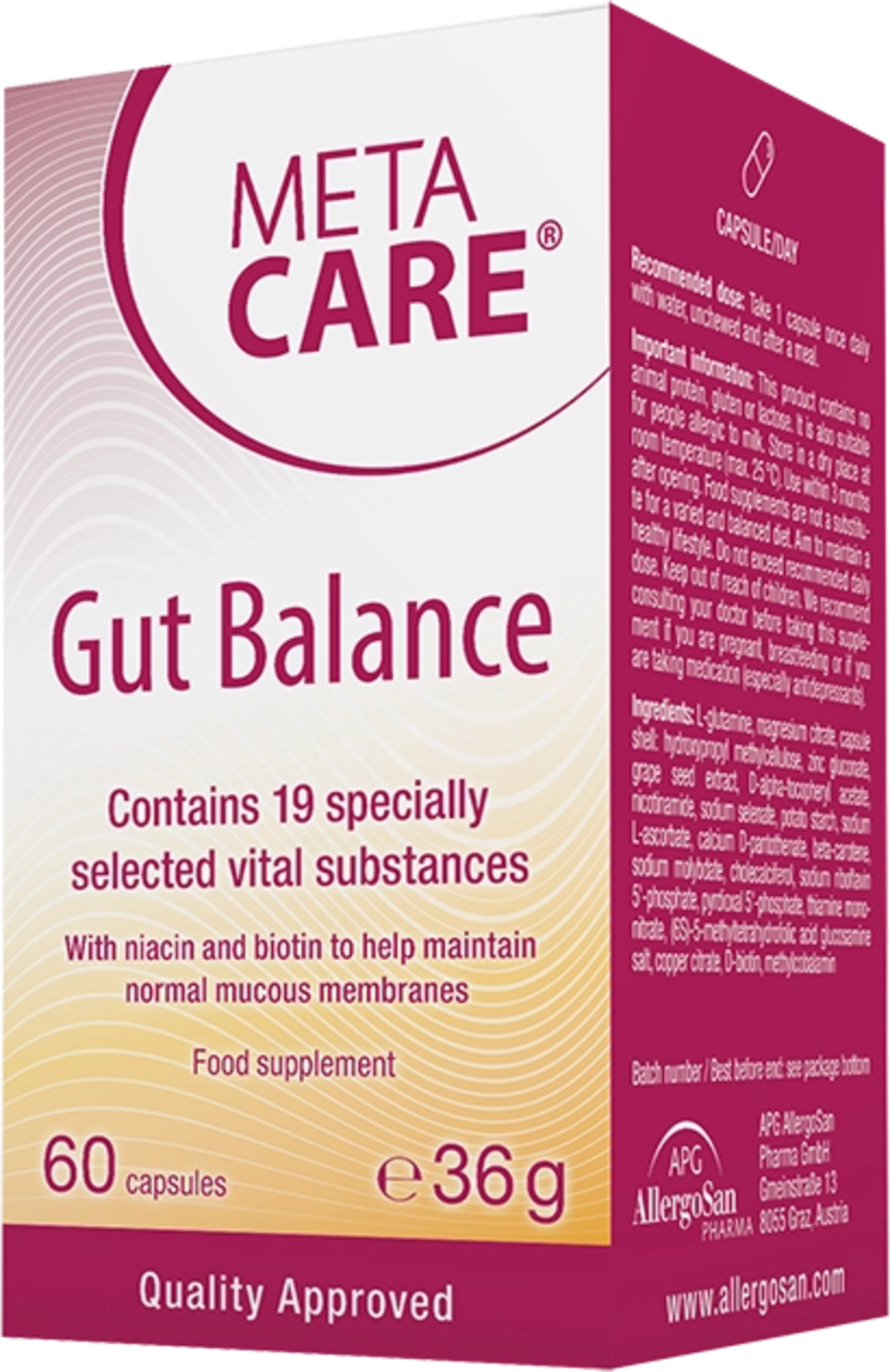 META-CARE® Gut Balance е хранителен комплекс с много витамини и минерали, особено за червата. Капсулите съдържат витамини С, D3, Е, В1 и В12, както и фолиева киселина, биотин, ниацин, магнезий, цинк и селен. Те са обогатени и с висококачествен екстракт от семена на грифония. Капсулите са с вегетарианска формула и не съдържат генно инженерство.