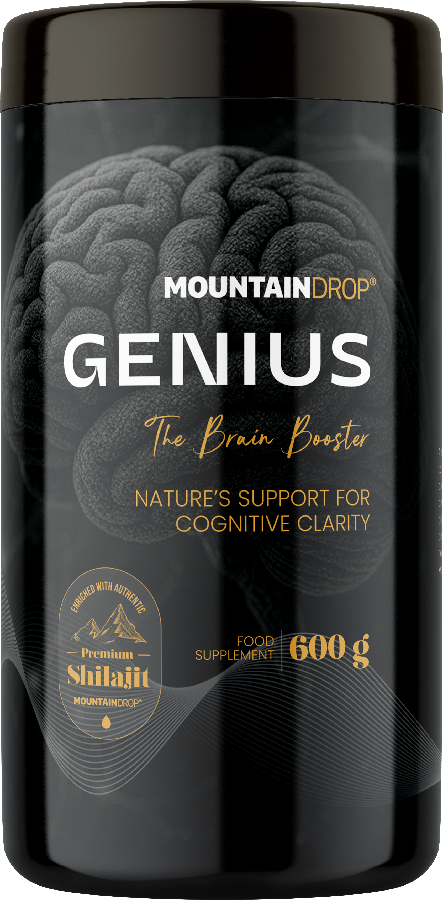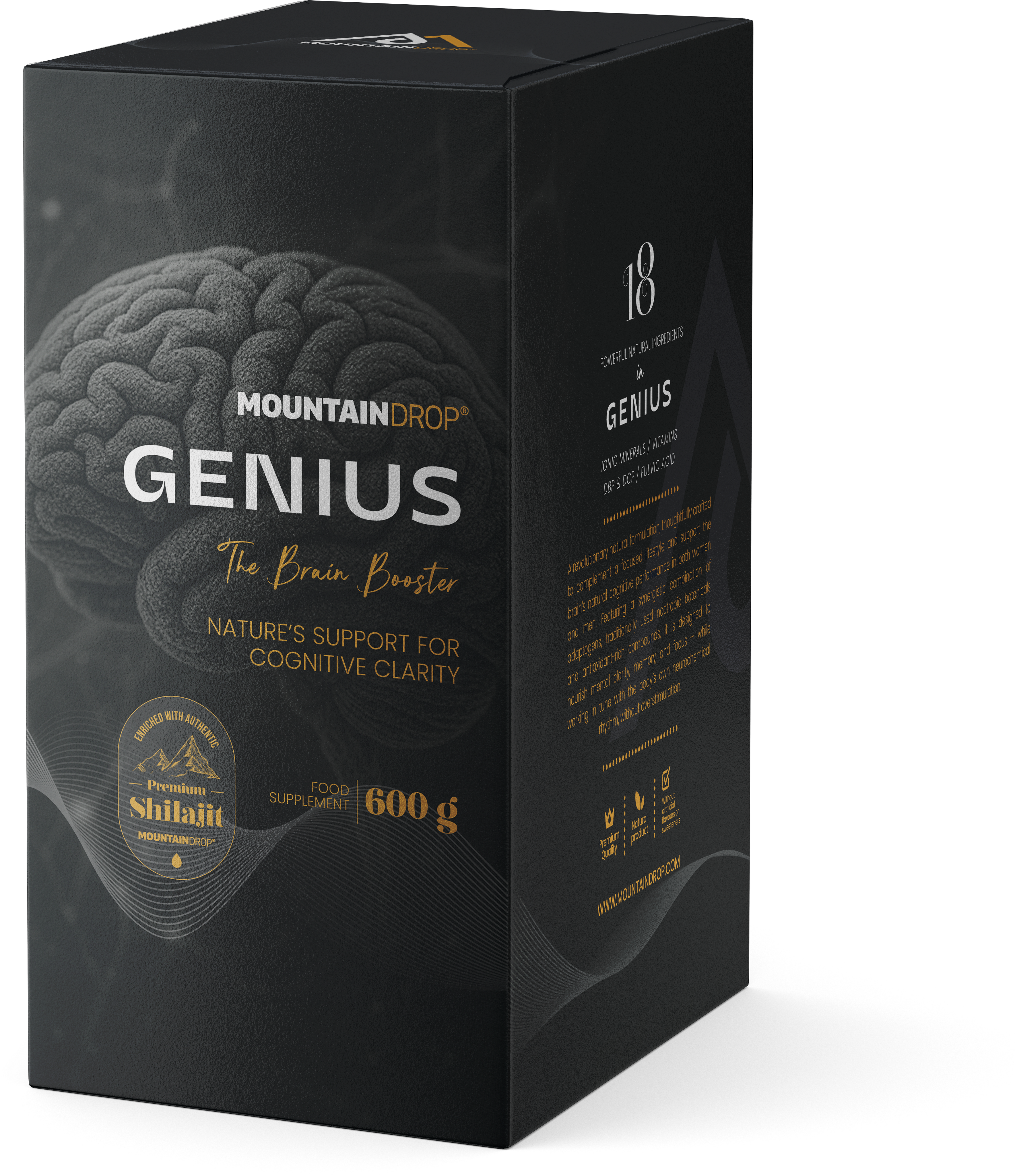 Genius от Mountaindrop е създаден на базата на богат на хранителни вещества премиум Shilajit, допълнен с 16 подбрани съставки. Формулата комбинира традиционно ценени растителни екстракти с фосфолипиди, коензим Q10, балансиран комплекс от витамини B и цинк. Черният пипер оптимизира бионаличността. Всяка партида от този словенски качествен продукт се контролира от независими лаборатории за чистота и остатъчни вещества.