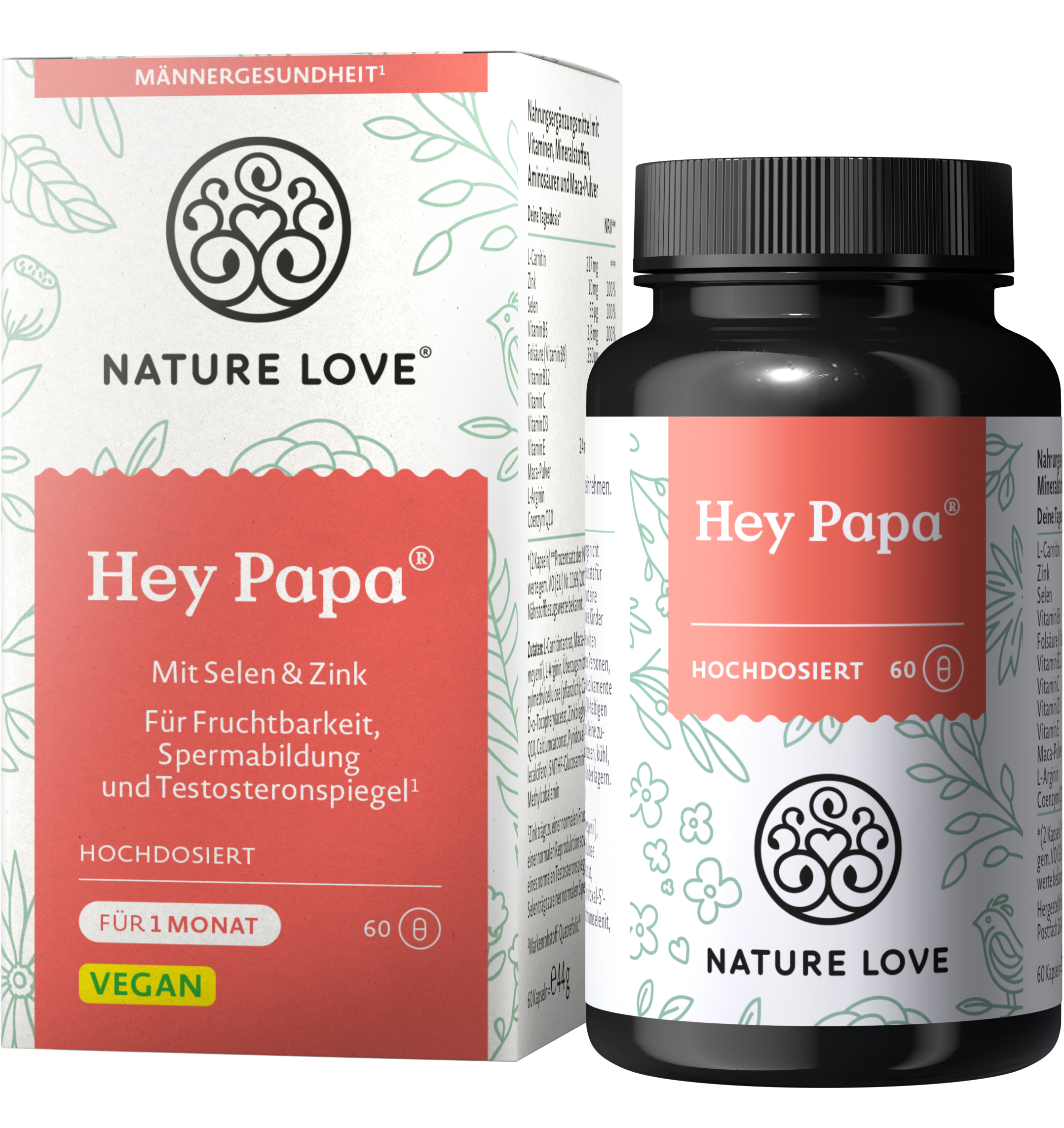 Капсулите Hey Papa от Nature Love подпомагат мъжете при желание за зачеване. Капсулите съдържат селен, цинк, мака, Q10, фолиева киселина и витамин D3. Тъй като витамин D3 е произведен от лишеи, капсулите са напълно веган.
