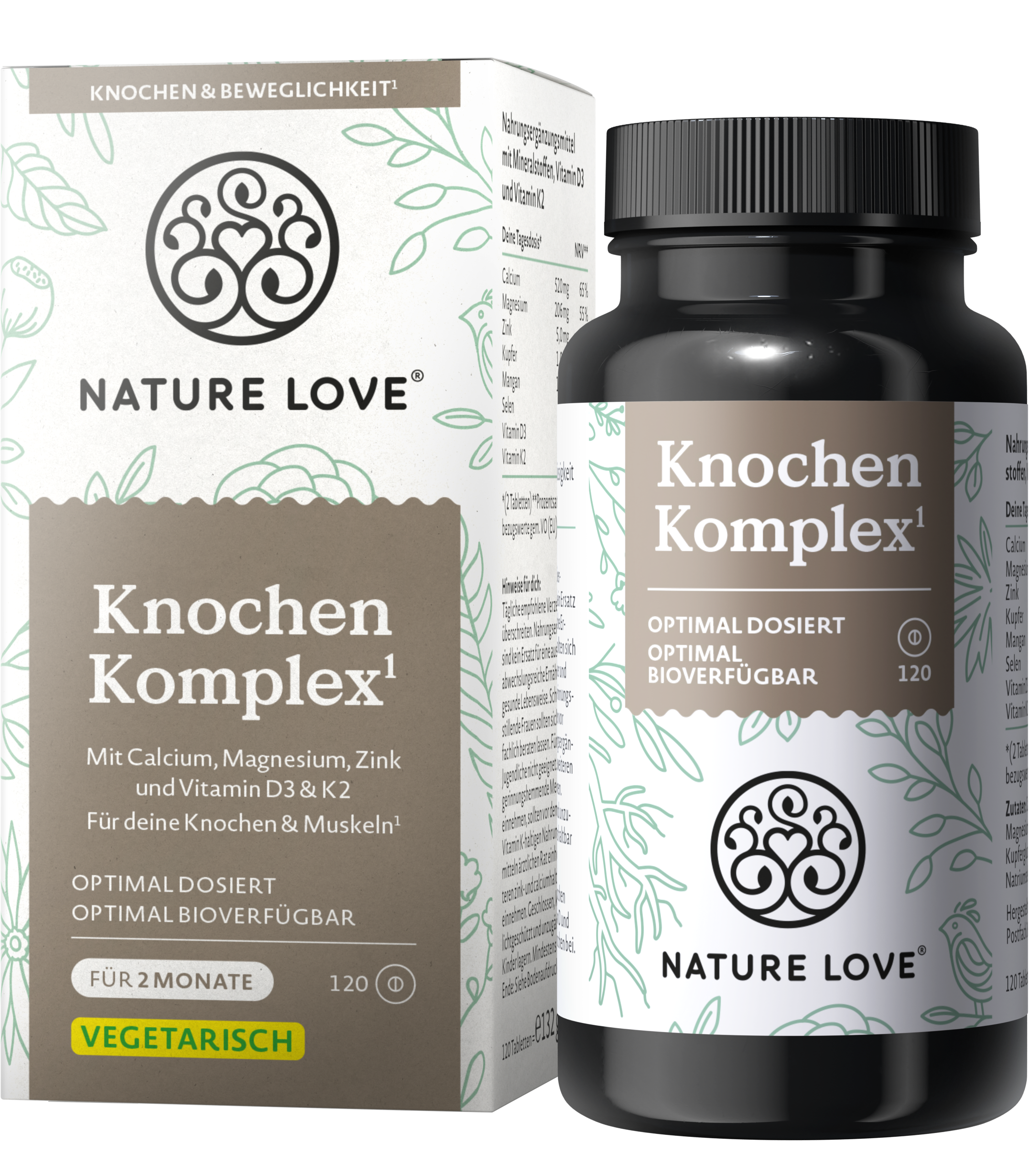 Вашите кости и мускули извършват огромна работа всеки ден и имат ключова роля във вашето здраве. Таблетките Knochen Komplex от Nature Love съдържат ценна хранителна смес, която подпомага оптимално вашето тяло. Те са обогатени с калций, магнезий, цинк, селен, мед и манган, както и с витамините D3 и K2.