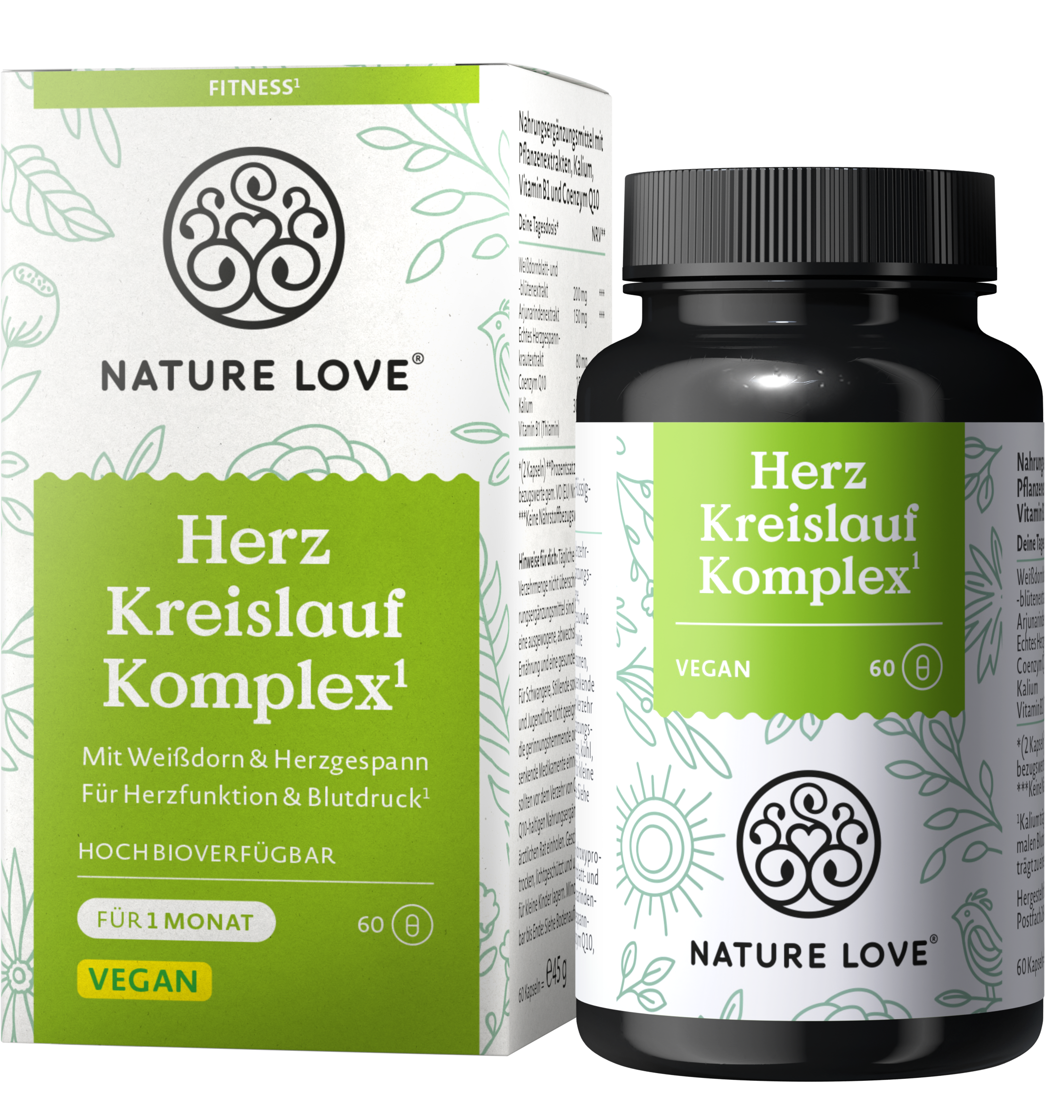 Сърцето ни бие безброй пъти ден и нощ и извършва работа, за която често дори не се замисляме. С капсулите Herz Kreislauf Komplex от Nature Love подпомагате това жизненоважно тяло по естествен начин. Капсулите са 100% веган, без ненужни добавки и съдържат висококачествени растителни екстракти от глог и дяволска уста. Коензим Q10, калий и витамин B1 допълнително подпомагат организма.