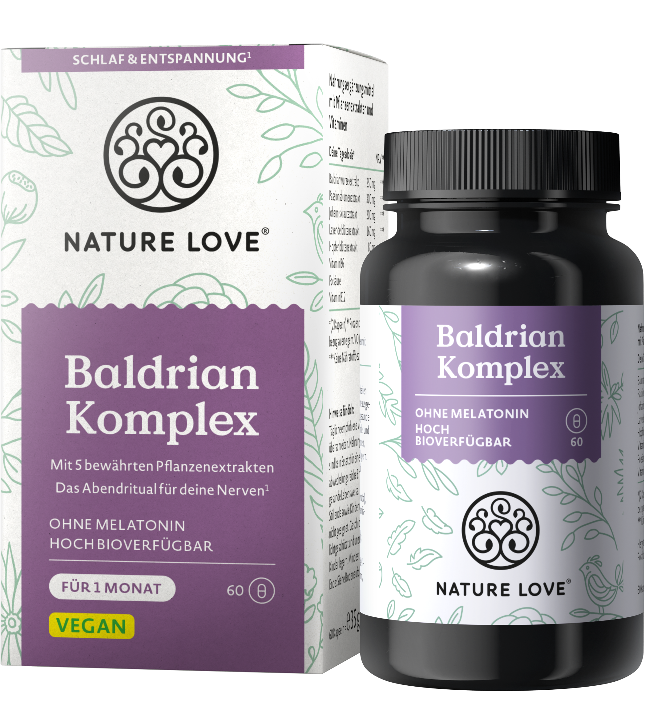 Baldrian Komplex от Nature Love е вашата идеална подкрепа преди лягане. Капсулите не съдържат мелатонин и са подходящи за всички, които не желаят да влияят на естествения си хормонален баланс. Вместо това капсулите съдържат валериана, пасифлора, жълт кантарион, лавандула, хмел и витамини от група B.