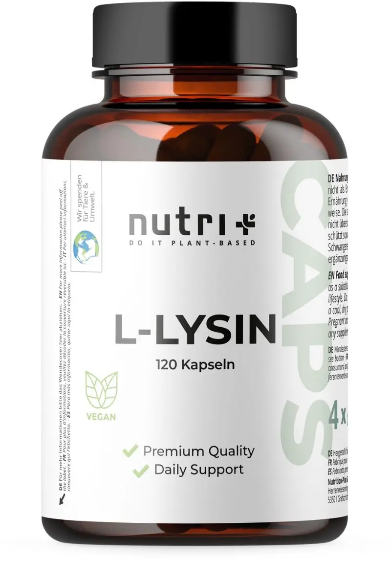 Капсулите Nutri+ L-лизин съдържат 2200 mg L-лизин на дневна доза (4 капсули) и не съдържат глутен, соя, захар, сол, подсладители и оцветители. Те са произведени в съответствие с най-високите стандарти за качество (IFS Food и GMP) - чисти, веган и без излишни добавки.