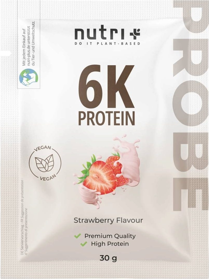 nutri + Пробен размер на веган протеин на прах 6K, Strawberry (30 г)
