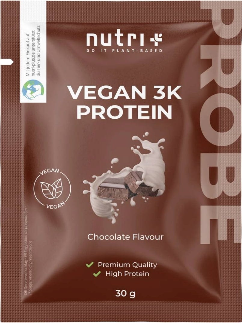 nutri + Пробен размер на вегански 3K протеин на прах, Chocolate (30 г)