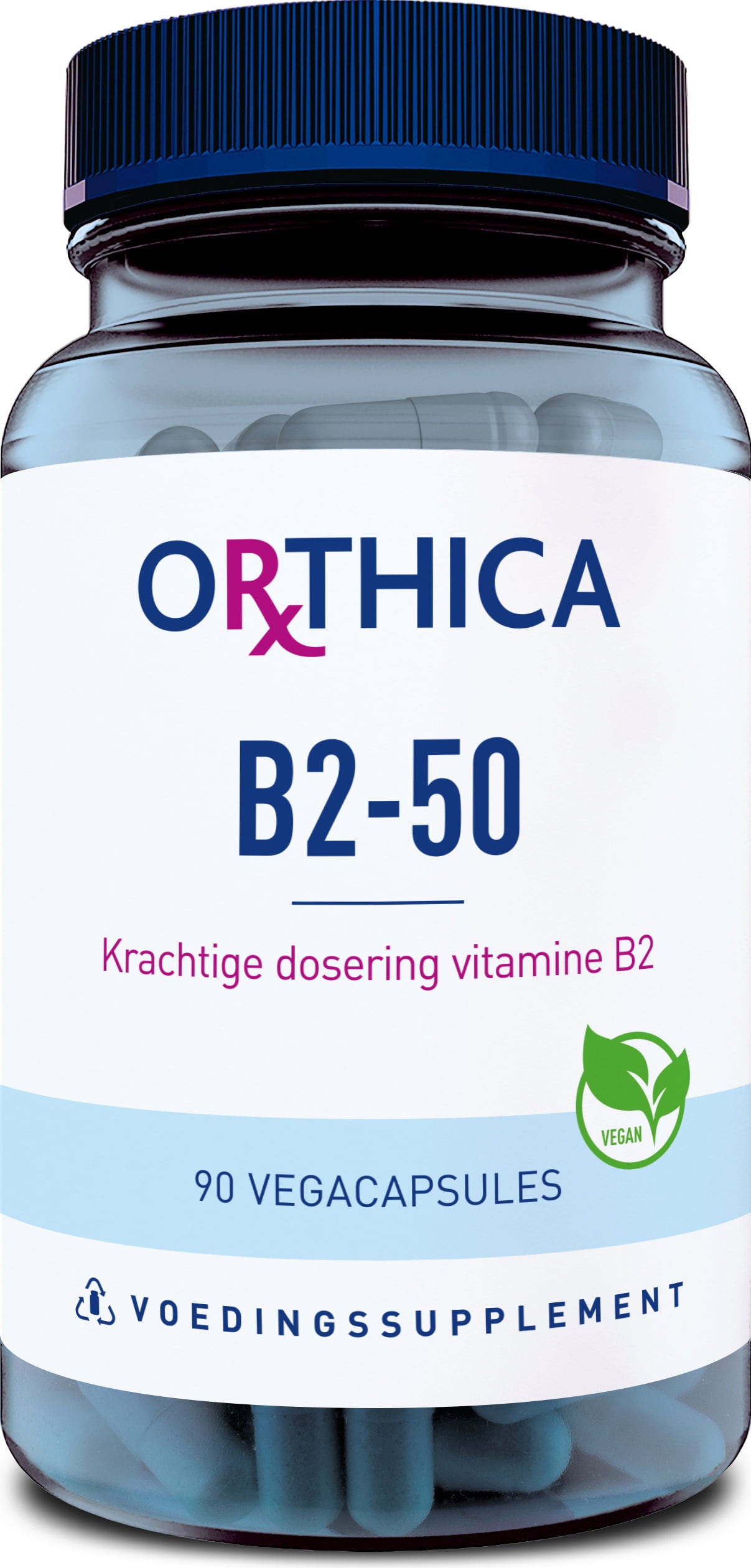 Orthica B2 - 50 съдържа 90 ценни капсули витамин B2. Те са безопасно затворени във вегетарианска капсулна обвивка. Капсулите могат да се консумират както от вегетарианци, така и от вегани.