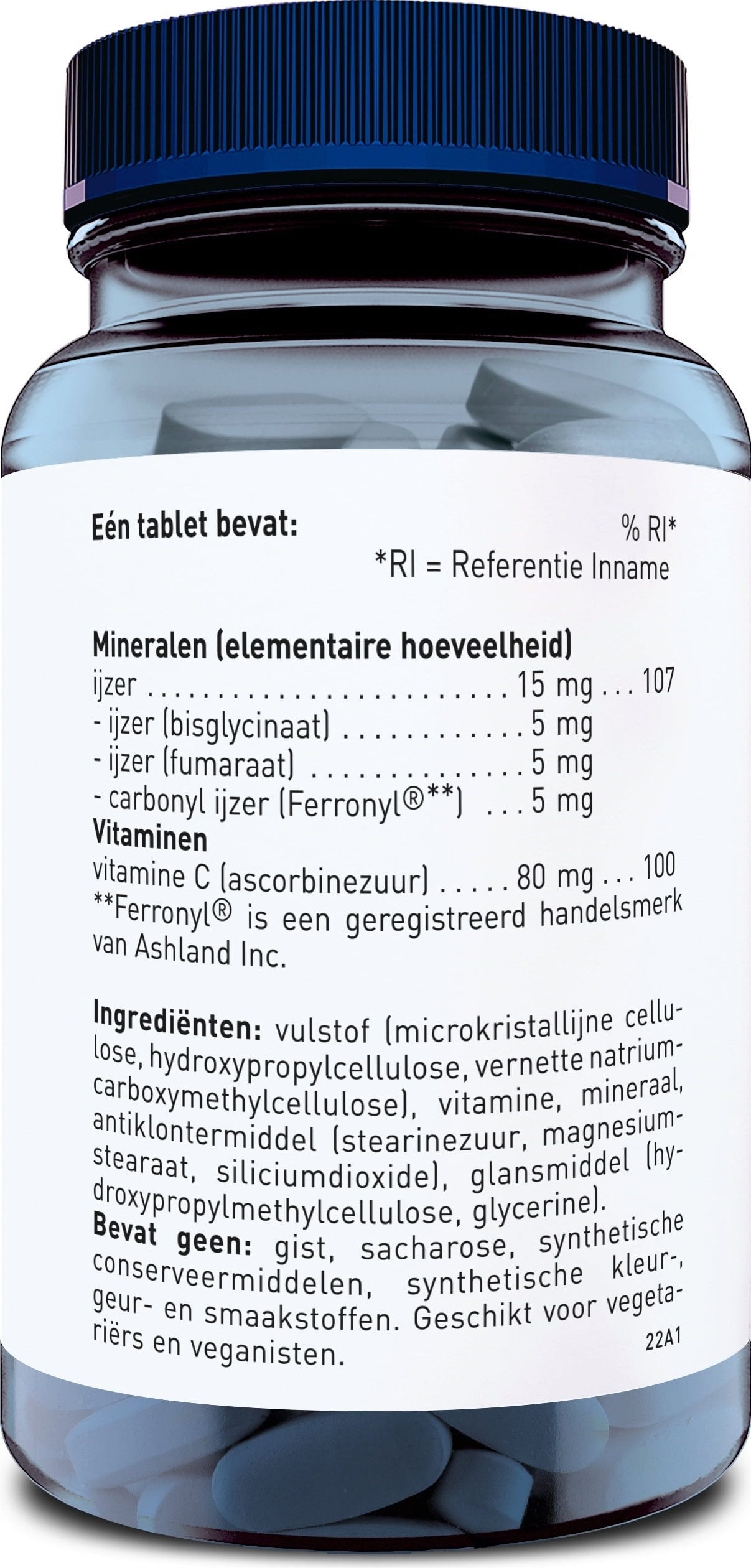 агент за зареждане (микрокристална целулоза, Хидроксипропил), L-аскорбинова киселина, покриващ агент (Hydroxypropylmethylcellulose), Eisenbisglycinat, Овлажнители (Натриева карбоксиметилцелулоза, Glycerin), железен фумарат, Карбонилно желязо - феронил, средства против слепване (магнезиеви соли на мастни киселини)