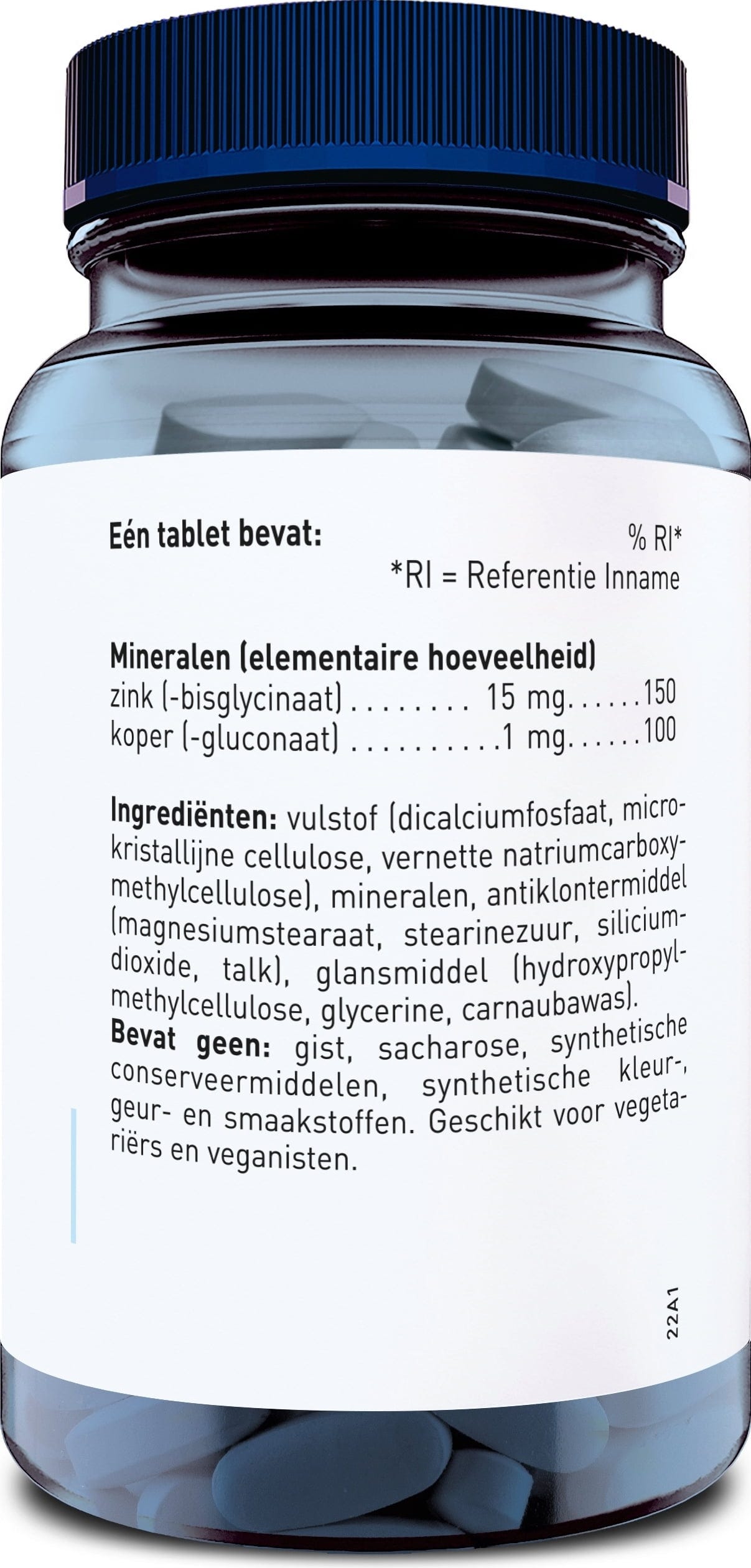агент за зареждане (калциеви фосфати, микрокристална целулоза, Натриева карбоксиметилцелулоза), цинков бисглицинат, средства против слепване (магнезиеви соли на мастни киселини, Хранителни мастни киселини, силициев диоксид, Талк), Меден глюконат, покриващ агент (Hydroxypropylmethylcellulose, Glycerin, Carnaubawachs)