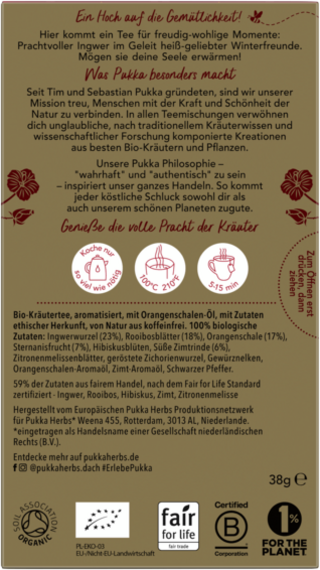 23 % Корен на джинджифил, 18 % Rooibos, 17 % Портокалови кори, 7 % Fructus Anisi Stellati, Хибискус, 6 % сладка кора на канела, Листа от маточина, Корен от цикория, карамфил, Портокалова кора Ароматно масло, Масло от кора на канела, Черен пипер