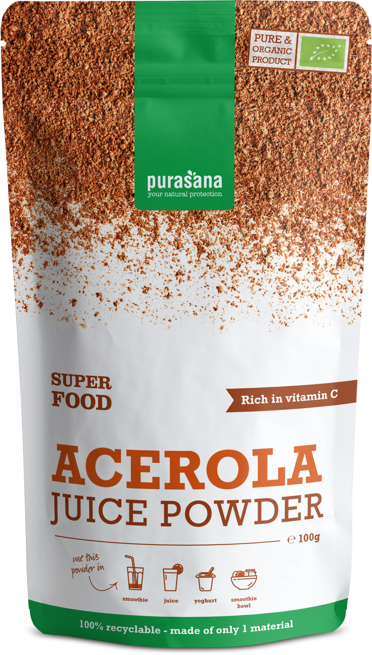 Ацеролата на прах от Purasana е чудесна добавка за вашите смутита, мюслита и други вкусотии със своя тръпчив и кисел вкус. Ацеролата е богата на витамин С, така че прахът е идеално допълнение към вашата диета.