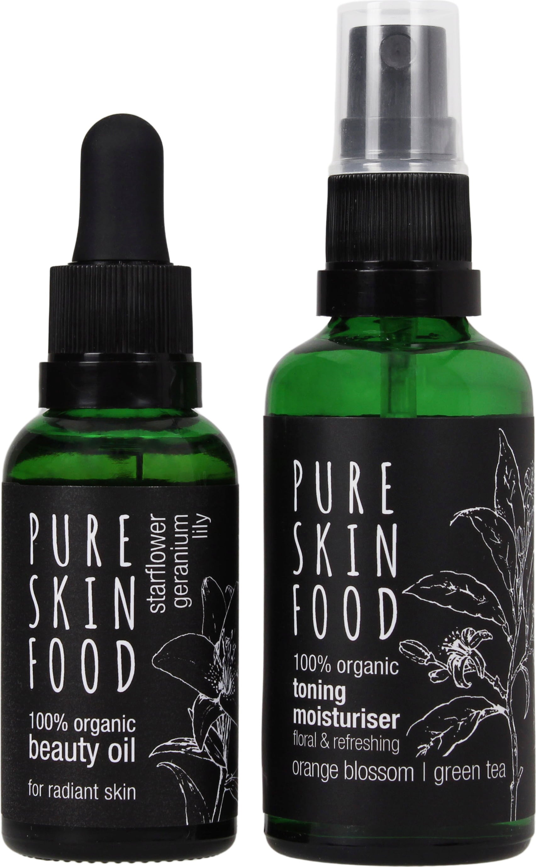 Този комплект придава на лицето ви красив блясък по много естествен начин. Естествените съставки като студено пресовани масла и билкови есенции осигуряват влага и приятно усещане. Комплектът се състои от: