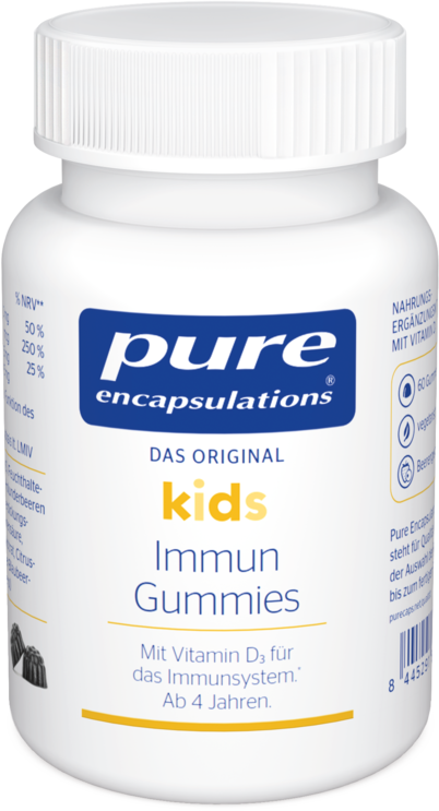 Kids Immun Gummies от Pure Encapsulations® съдържат допълнителна порция витамини и поддържат вашето дете в предизвикателни периоди. Те са обогатени с витамин C и D, цинк и екстракт от бъз. Бонбоните са без добавена захар, без желатин и без ненужни добавки.