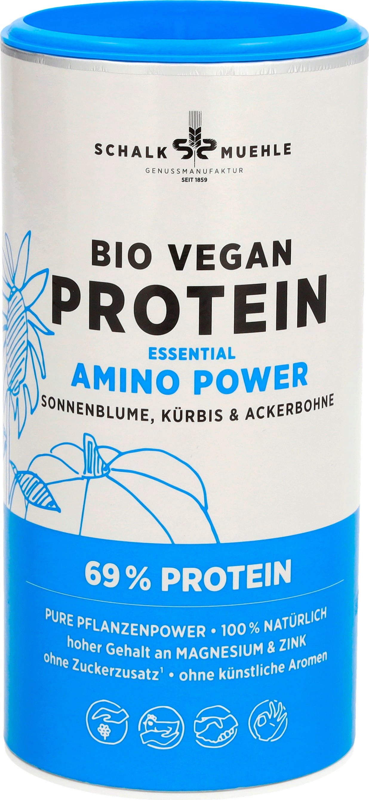Протеиновият прах Organic Vegan Essential Amino Power на Schalk Mühle предлага не само значително количество протеин, но и всички есенциални аминокиселини, заедно с високи нива на магнезий и цинк. Тази висококачествена смес е направена от слънчогледови семки, боб и тиквени семки. Рецептата е изцяло на растителна основа и не съдържа добавена захар, което я прави отличен избор за веган и разнообразен начин на живот.